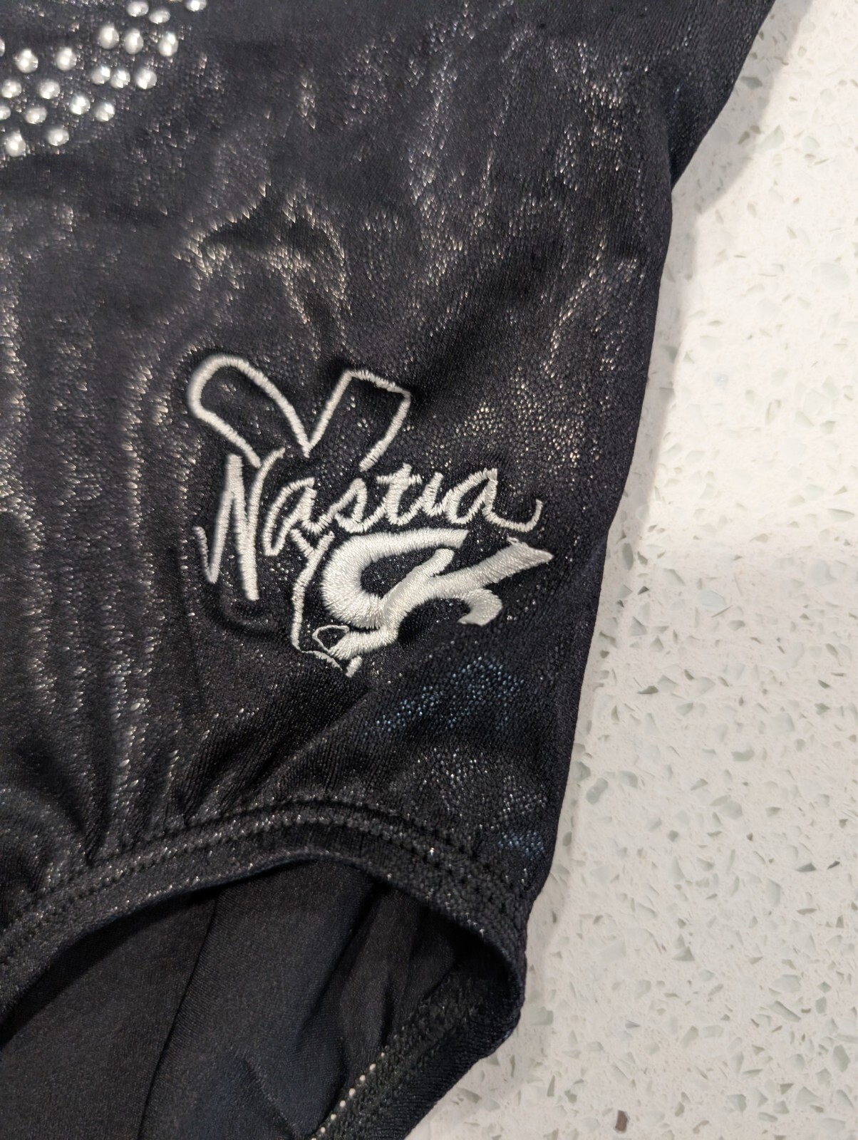 BEAUTIFUL GK Elite NASTIA LIUKIN Gymnastics Dance Leotard Large Silver Black