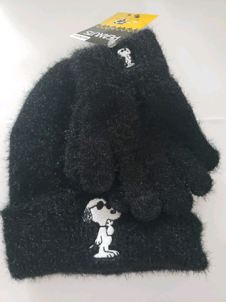 NEW 75 YEARS PEANUTS SNOOPY BEANIE HAT GLOVE SET, KIDS ONE SIZE FUZZY BLACK