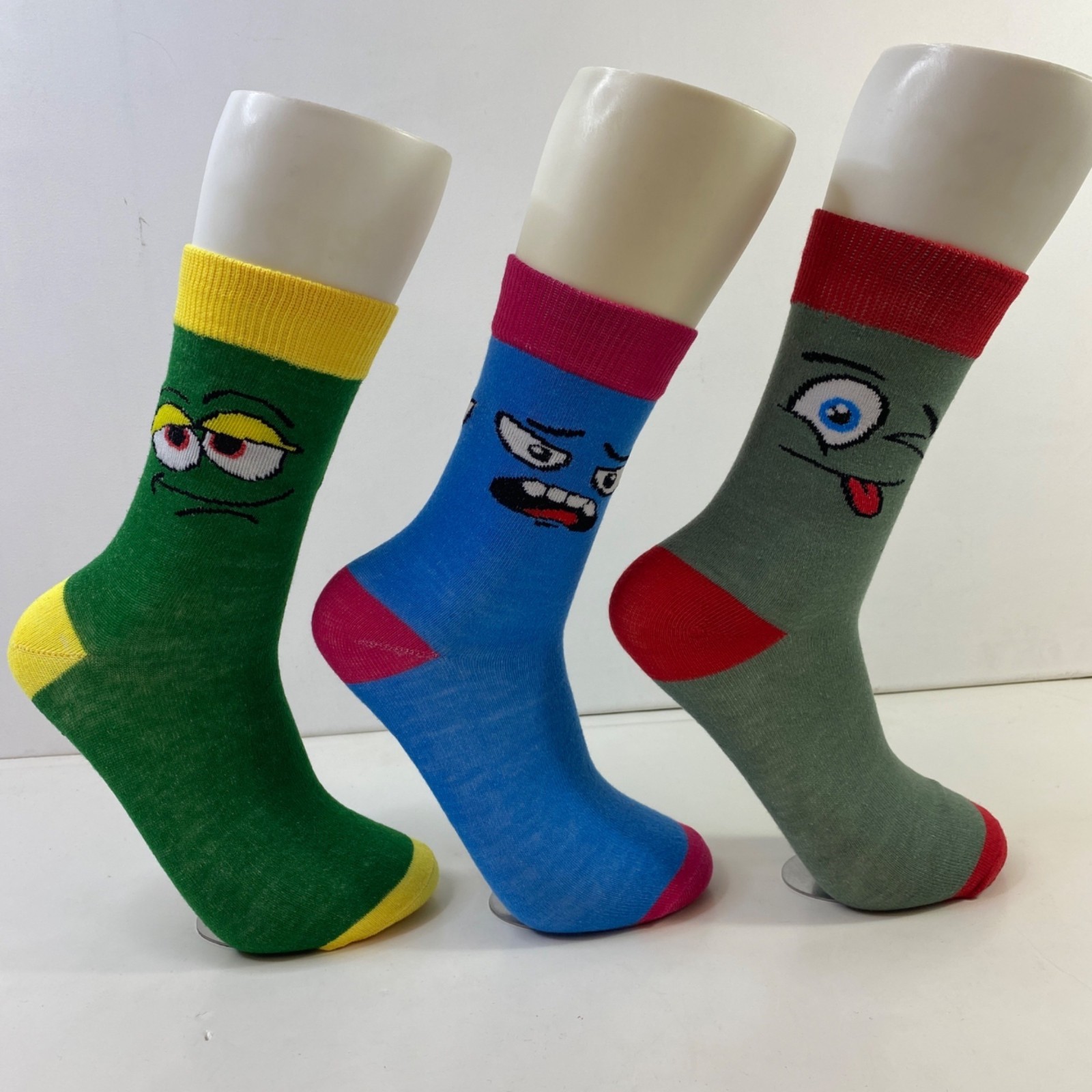 Cartoon Face Three-Pack Crew Socks For Boys Or Girls - Vibrant Colors Expressi