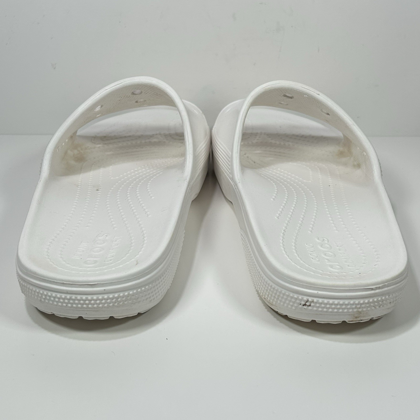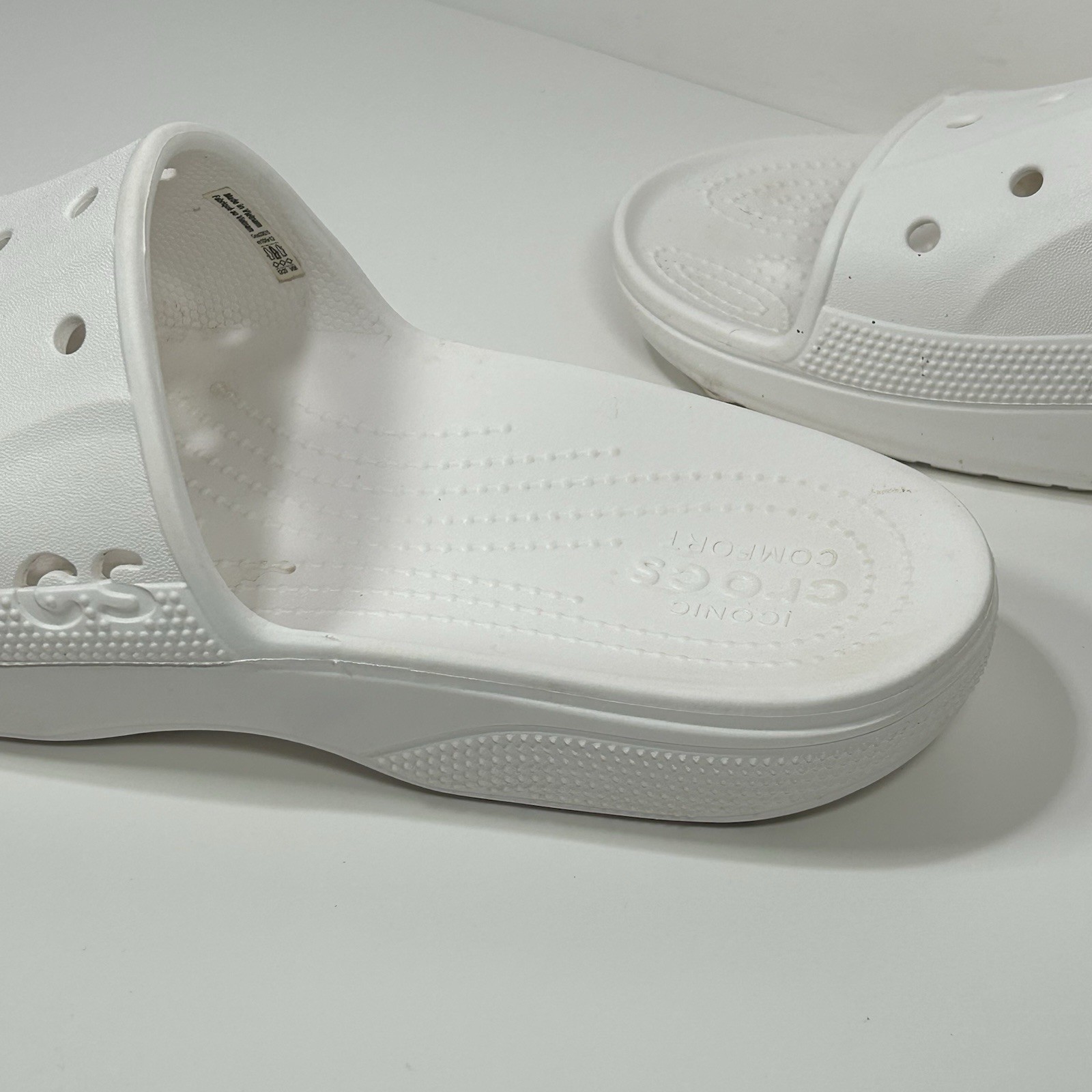 Crocs Baya Slide Slip On Sandals Mens 10 Womens 12 White Pool Comfort Spell Out
