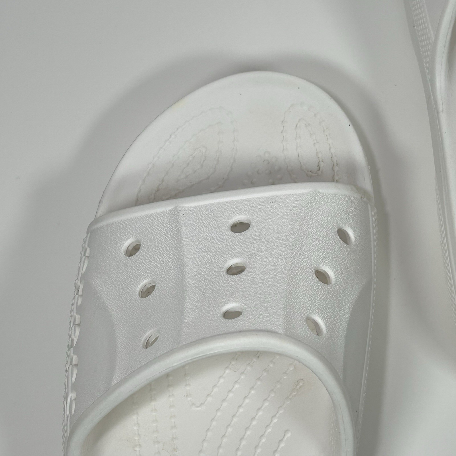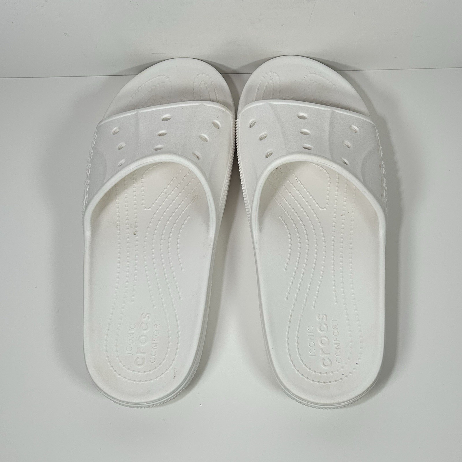 как выглядит Crocs Baya Slide Slip On Sandals Mens 10 Womens 12 White Pool Comfort Spell Out фото