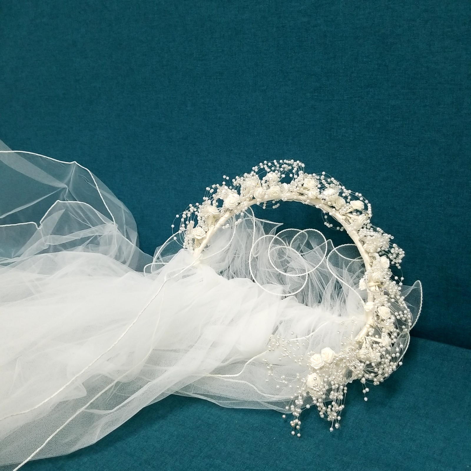 как выглядит VTG Beaded Bouffant Wedding Veil Double Tier NO YELLOWING фото