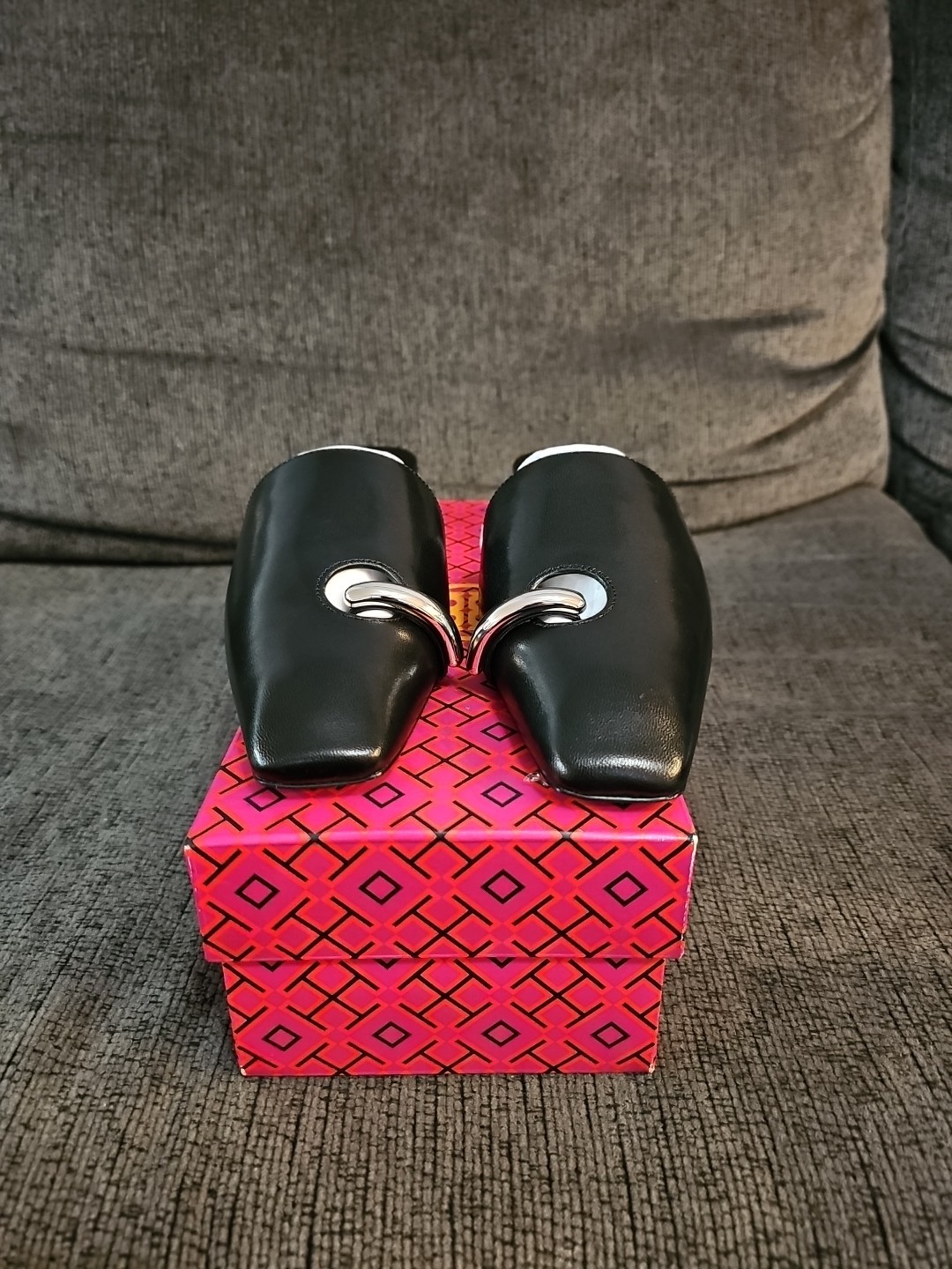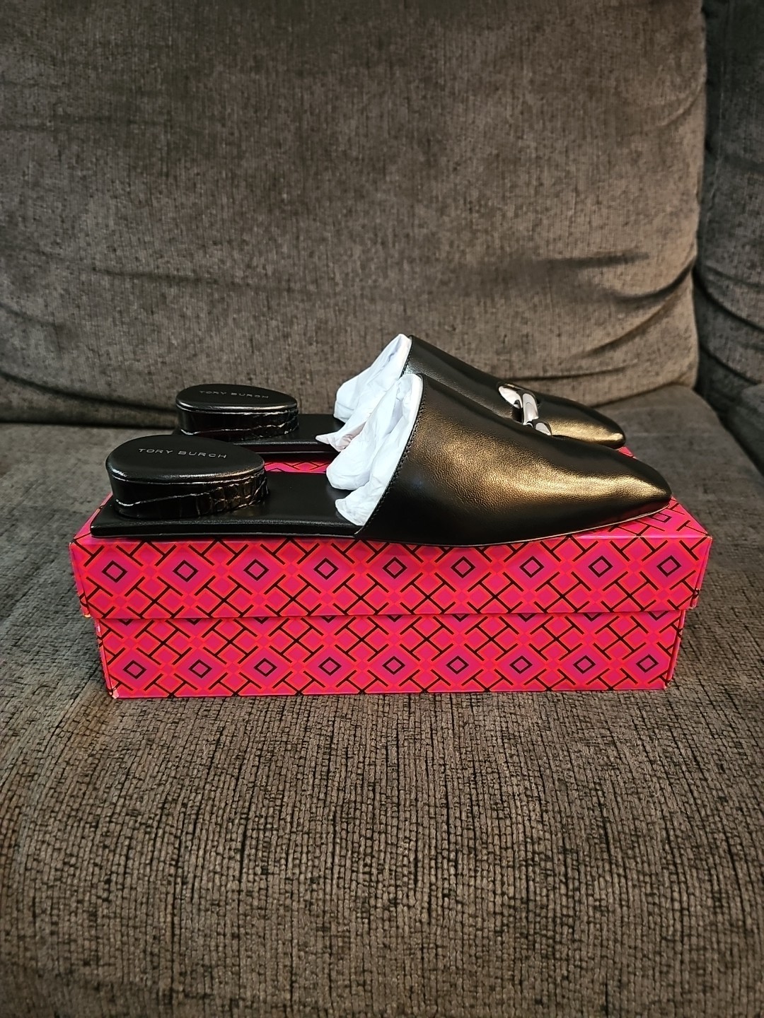 как выглядит Tory Burch Womens Pierced Mule Goat Leather/Embossed Leather in Black Size 8 фото