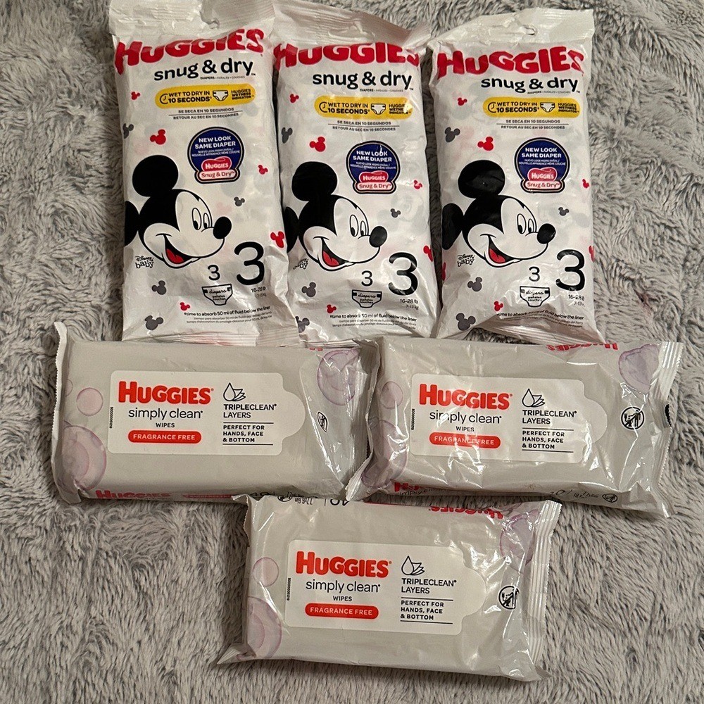 Huggies Snug Dry Diapers size 3 x 9 and Simply Clean Wipes x 120 Lot Baby
