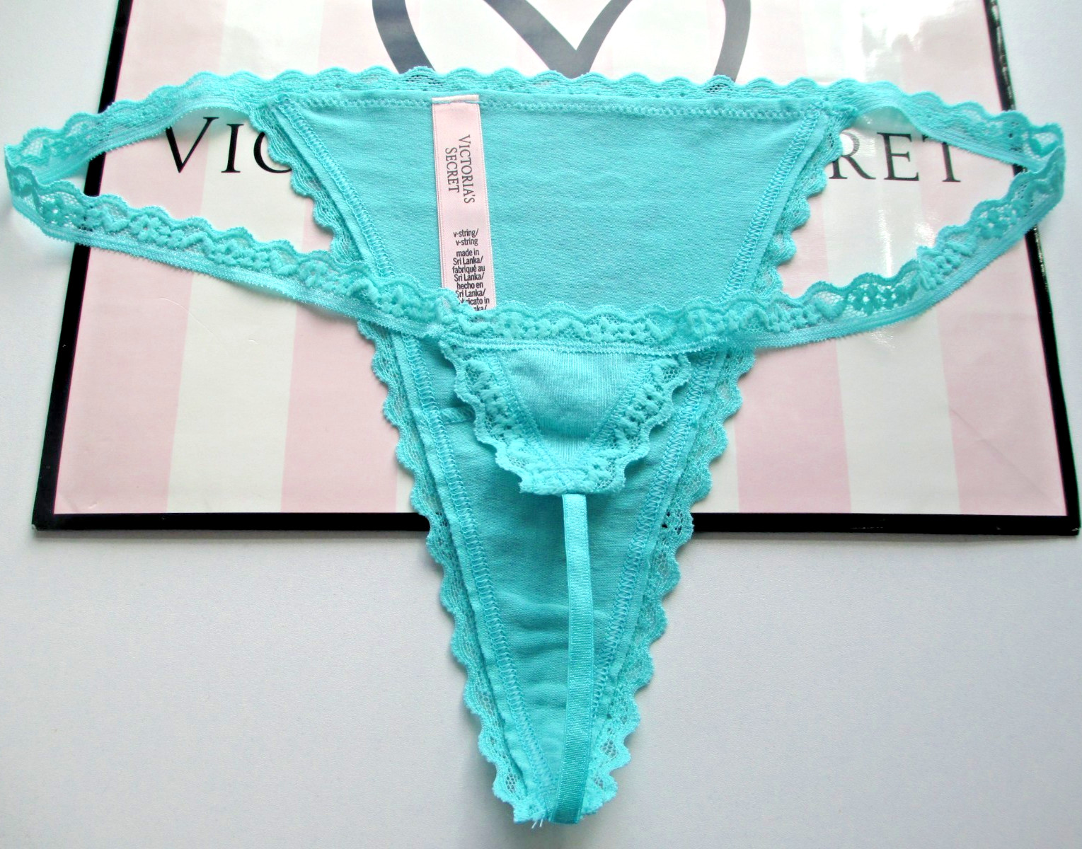 как выглядит VICTORIAS SECRET Cotton V-String Thong Panty VS Lace Trim S M XL Aqua Blue NWOT фото