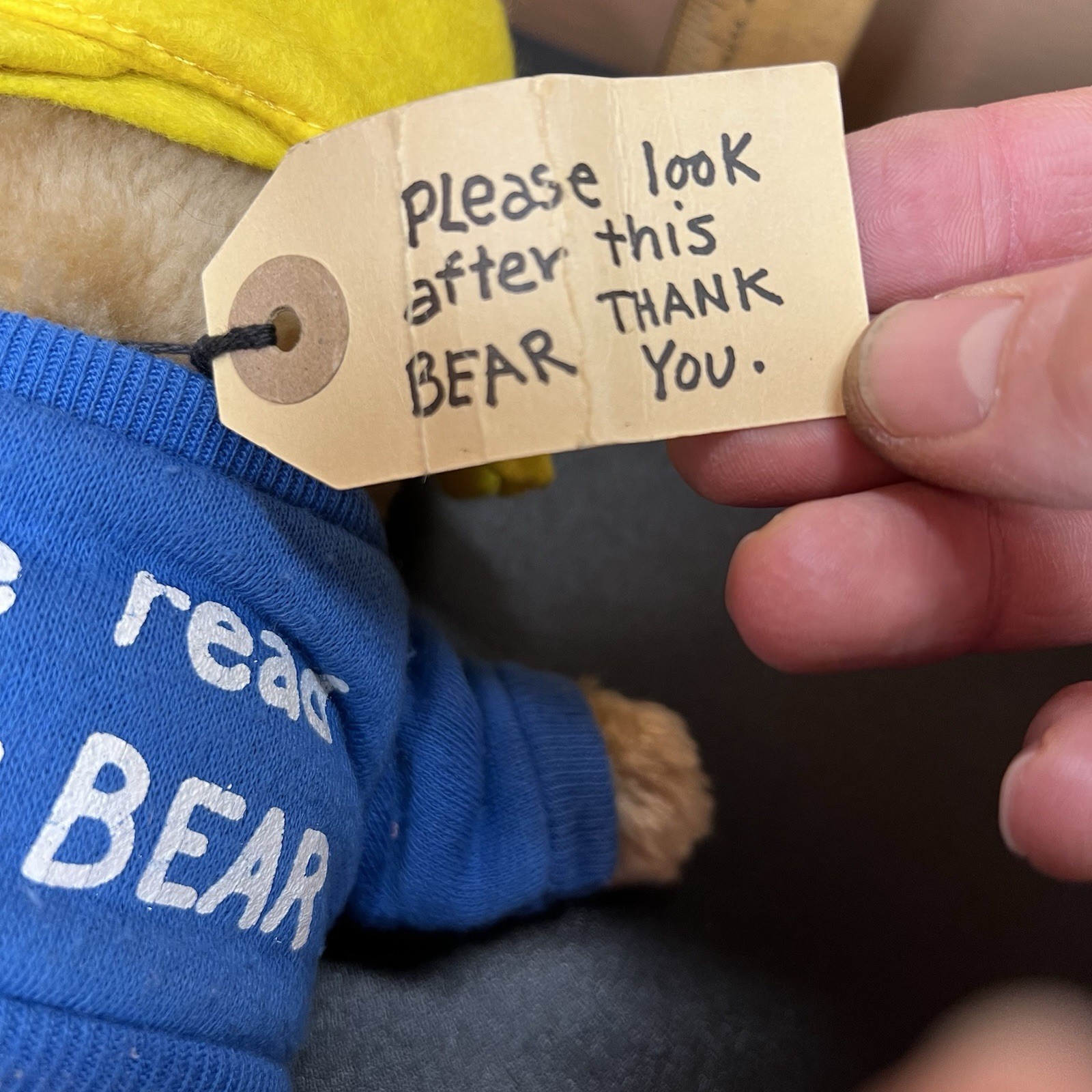 VTG Eden Toys 10 Paddington Bear Plush Please Read to this blue sweatshirt
