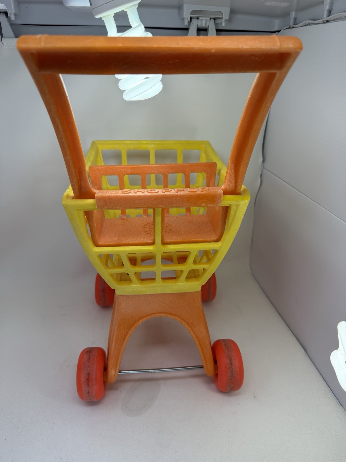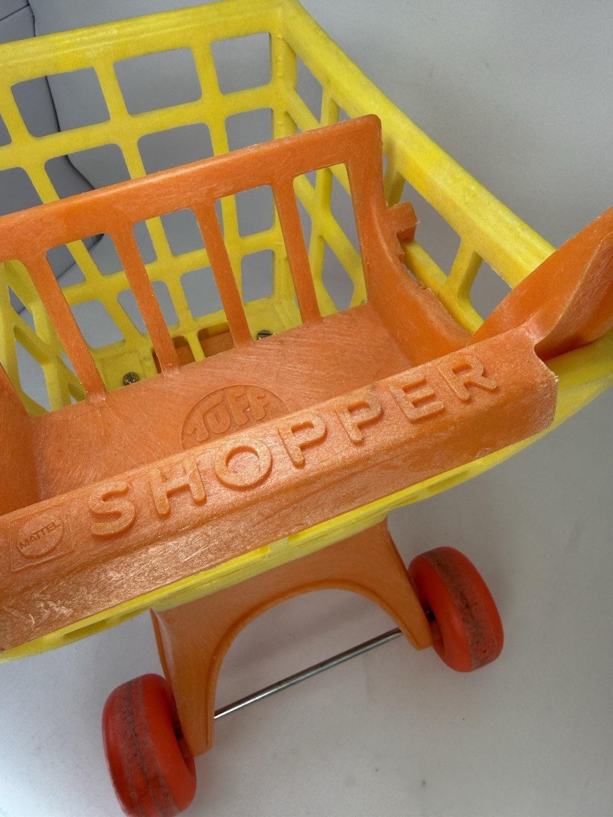 Vintage 1972 Mattel Tuff Stuff Orange Yellow Kids Toy Shopping Cart W/Play Food