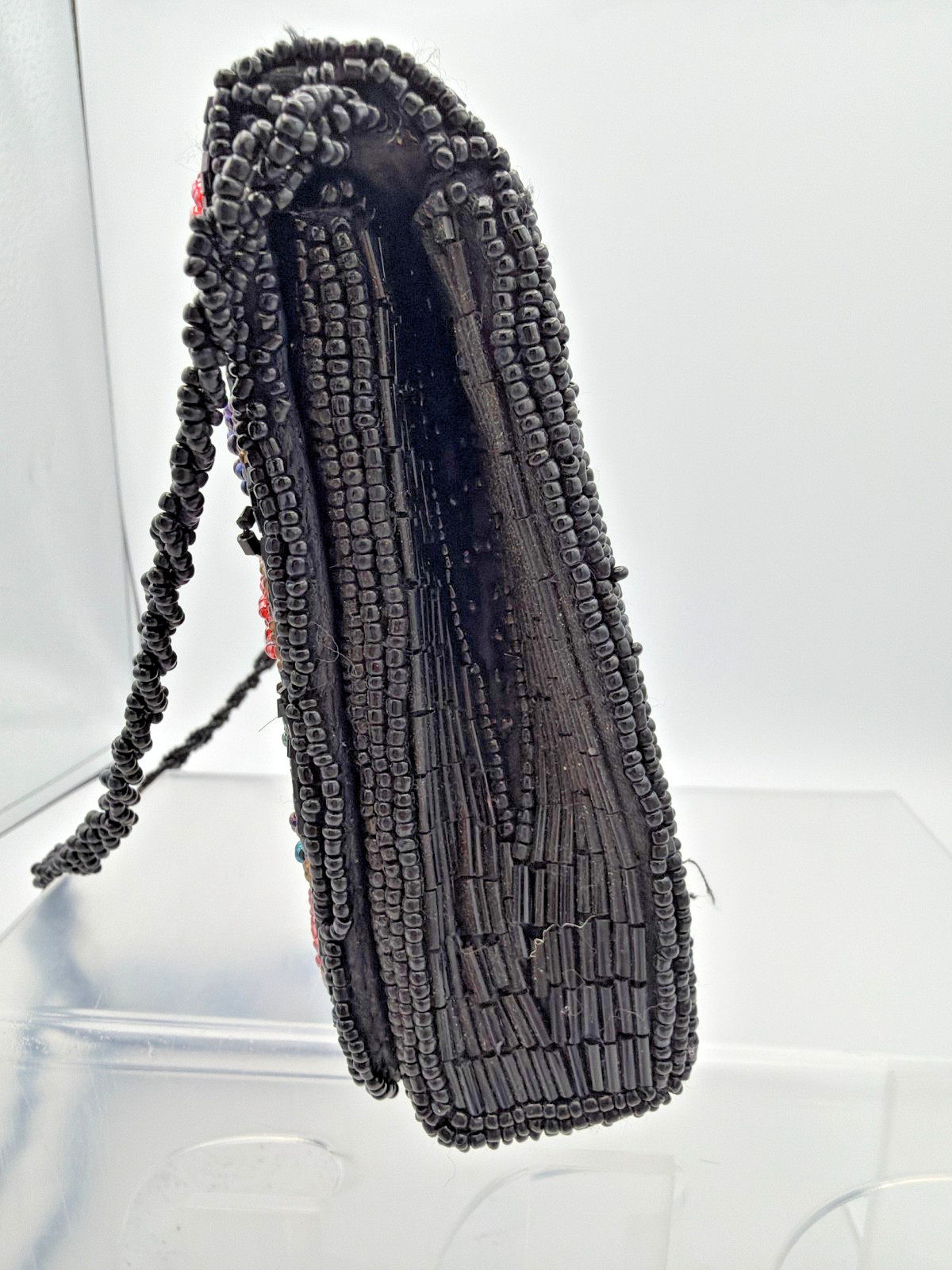 Black Beaded Floral Shoulder Bag Evening Purse Long Strap Vintage Style