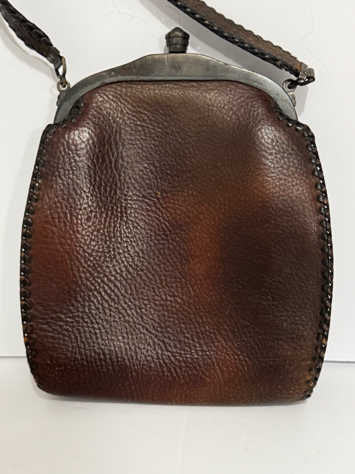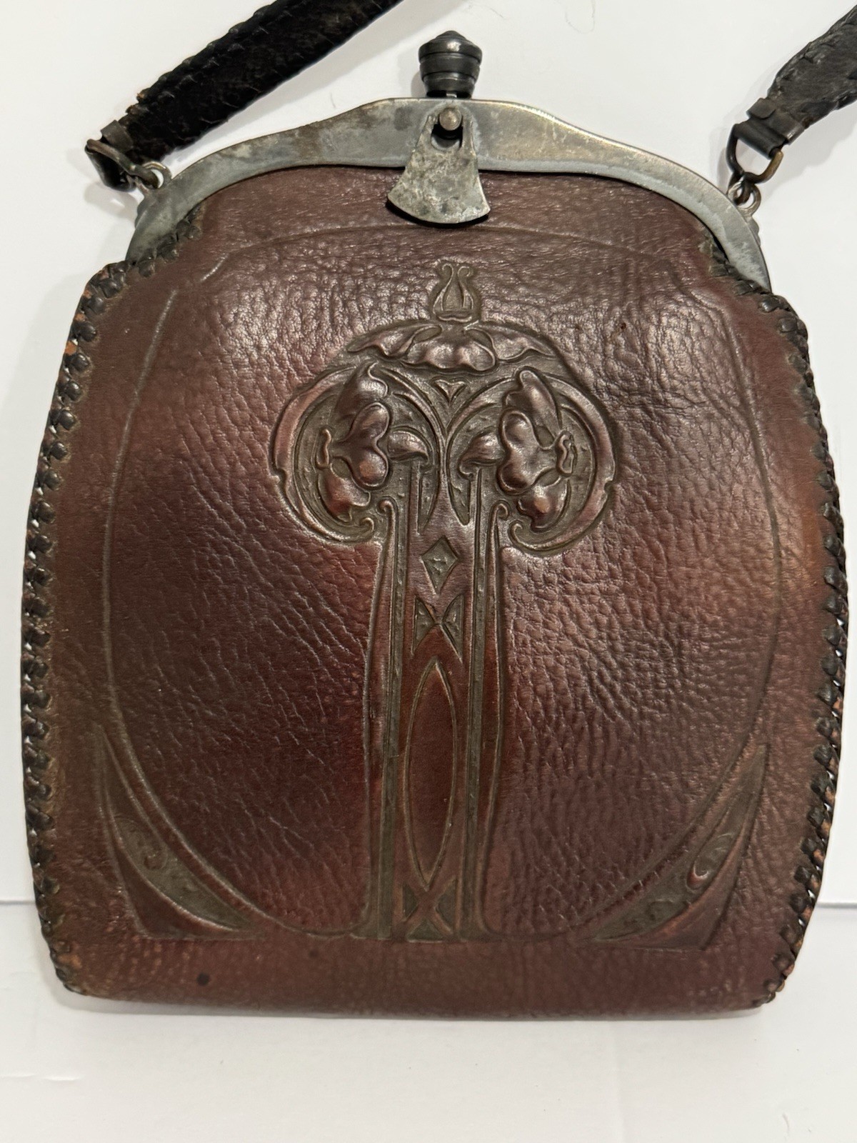 как выглядит Antique Tooled Leather Arrs And Crafts Jemco Purse With Beveled Mirror 1920s фото