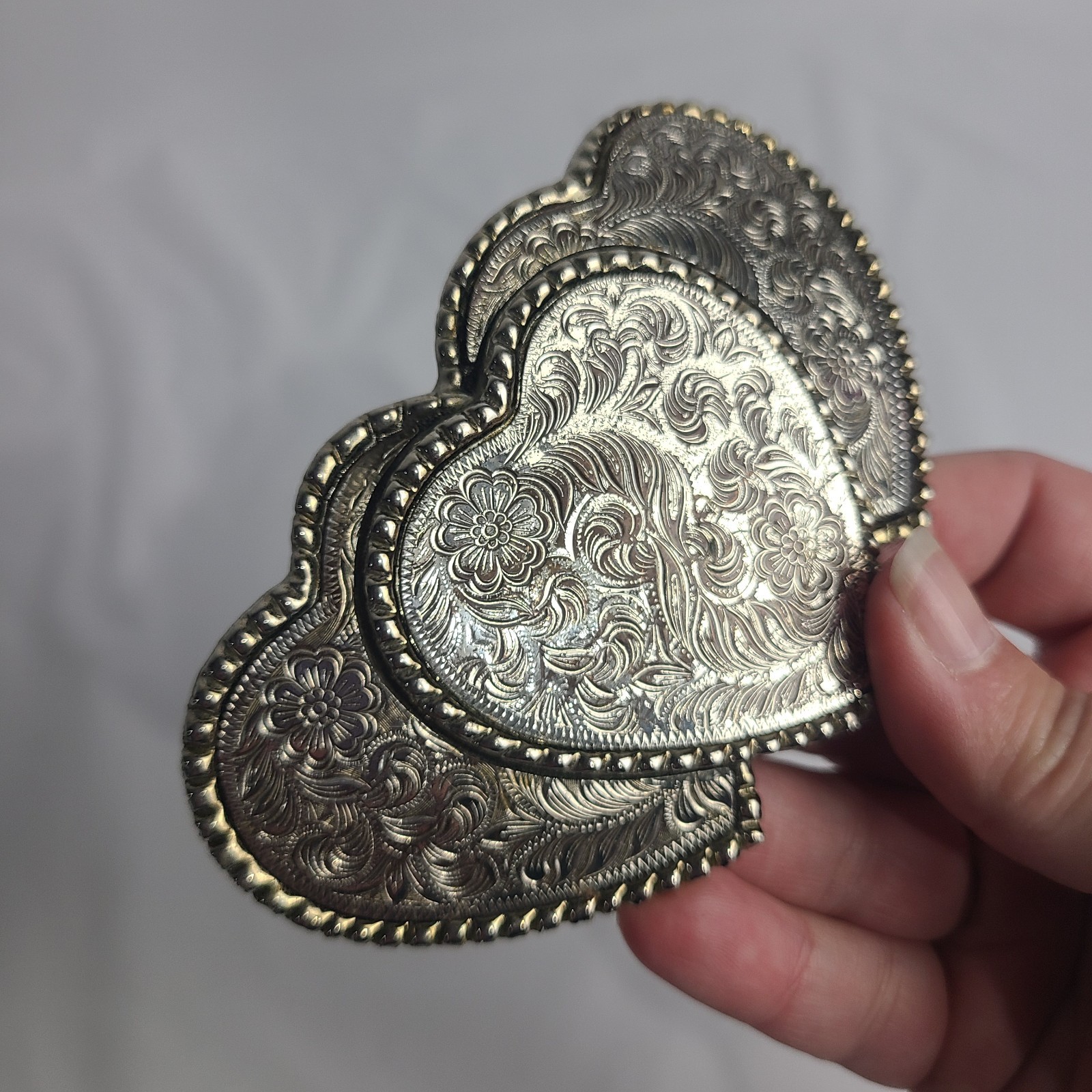 Vintage Triple Heart Shaped Flower Swirl Ornate Etched Floral Belt Buckle W USA