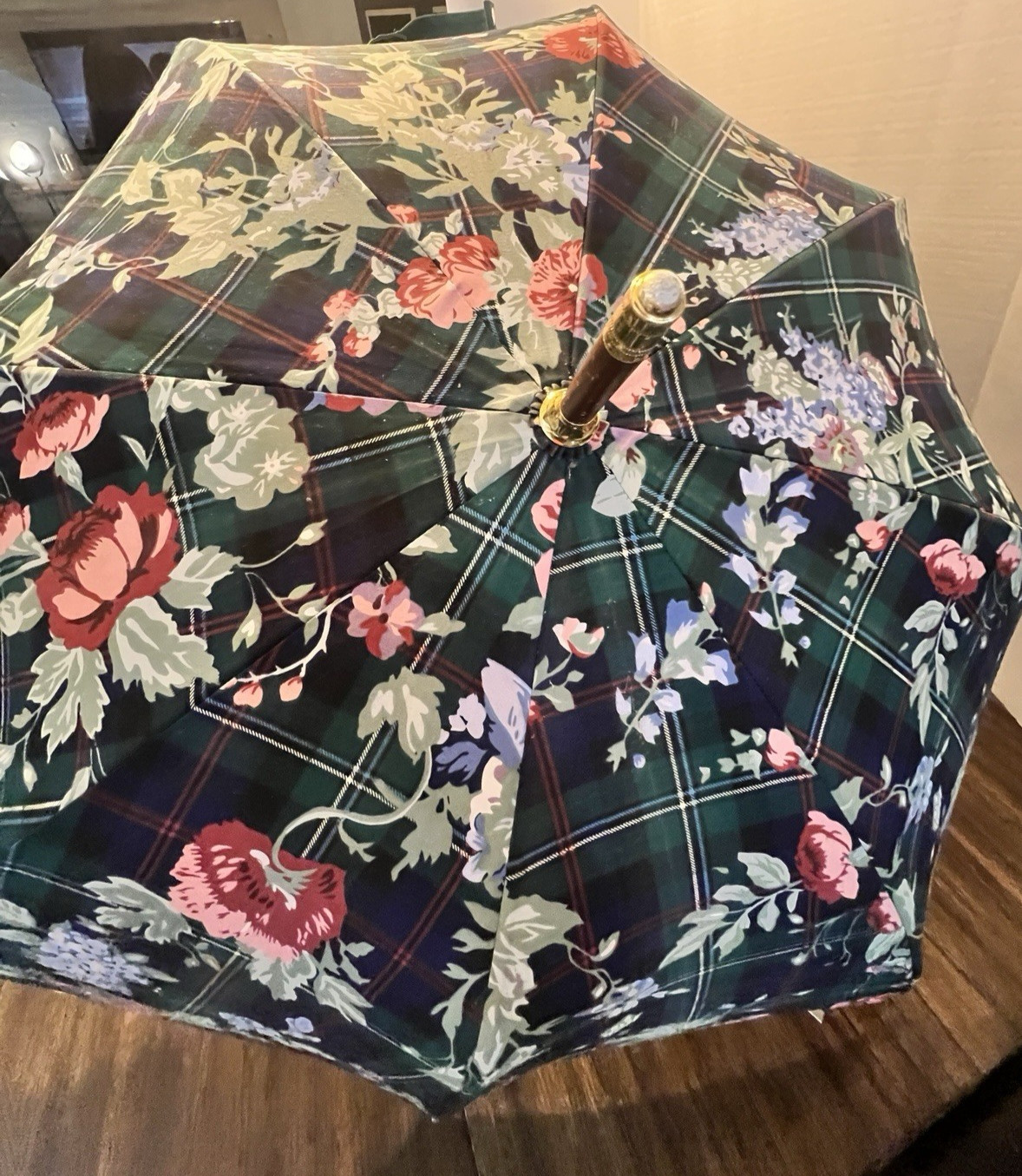 VTG Ralph Lauren Umbrella Floral Plaid Green Navy Blue Parasol Wood Cane Handle