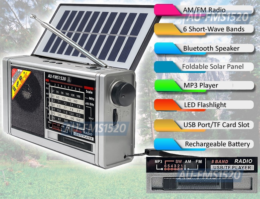 Solar-Powered Emergency Shortwave Radio AM FM Bluetooth Speaker MP3 Player Torch