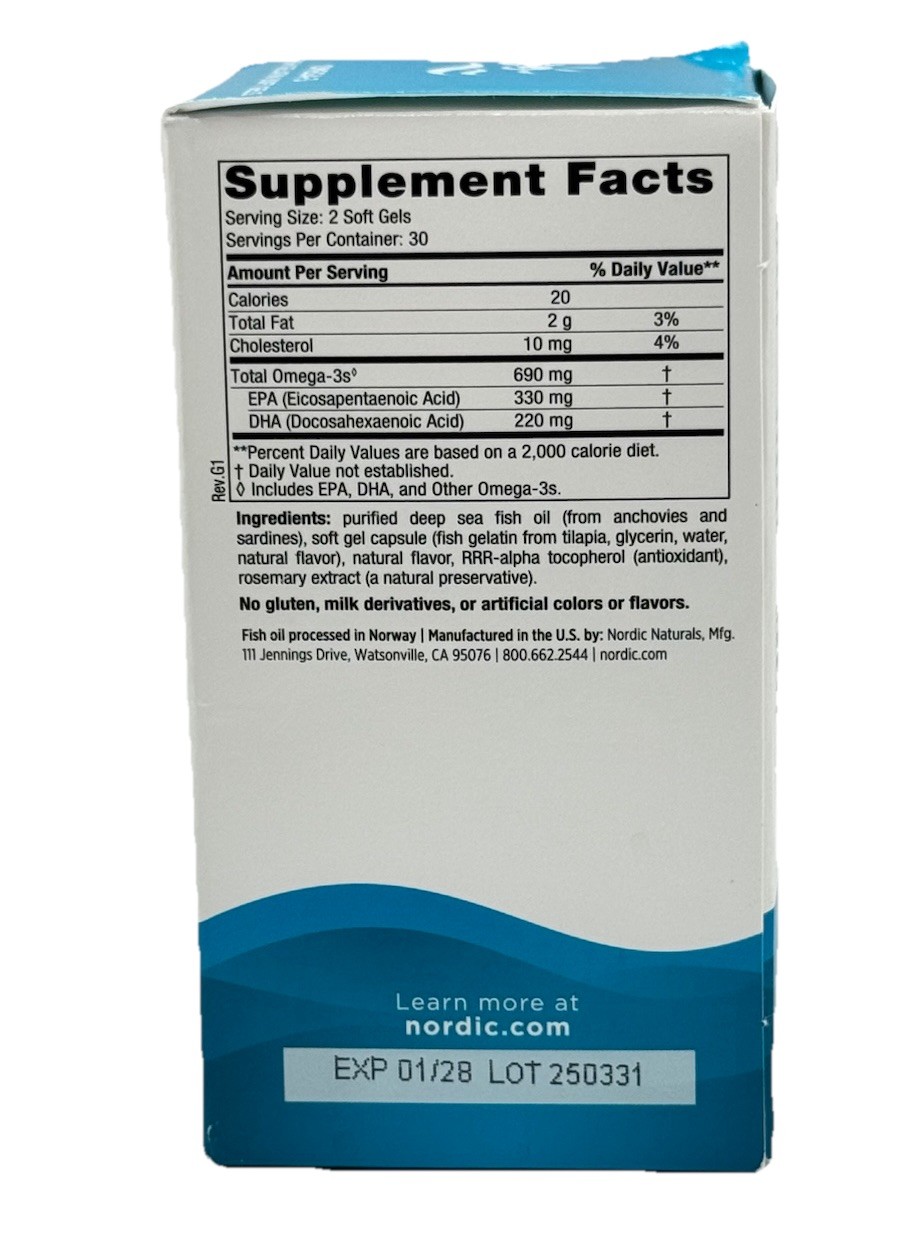 Nordic Naturals Omega-3 Fish Gelatin 690mg 60ct Ex 01/2028 Box Damaged