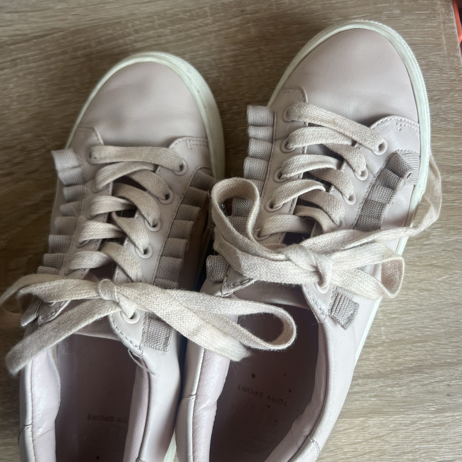 как выглядит Tory Sport Tory Burch Light Pink Leather Ruffle Lace-Up Trainer Sneakers 6 фото