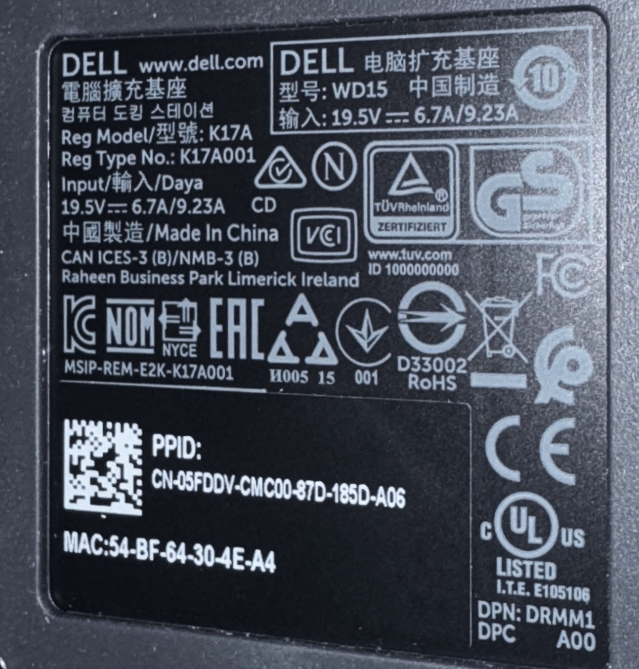DELL K17A001 - WD15 Docking Station K17 K17A Thunderbolt USB-C 4K Dock