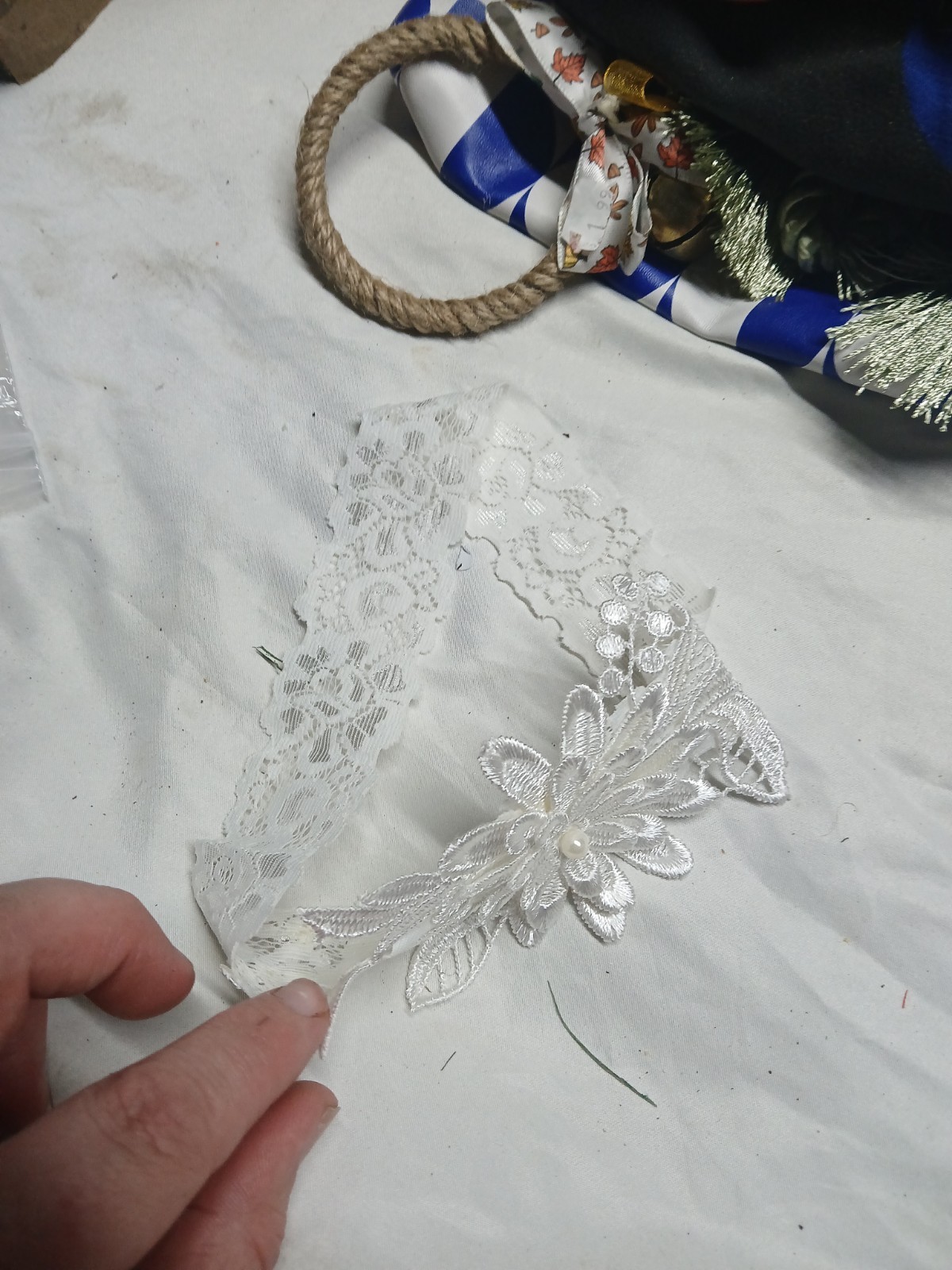 как выглядит white lace bridal garter with a floral and pearl accent. Handmade фото