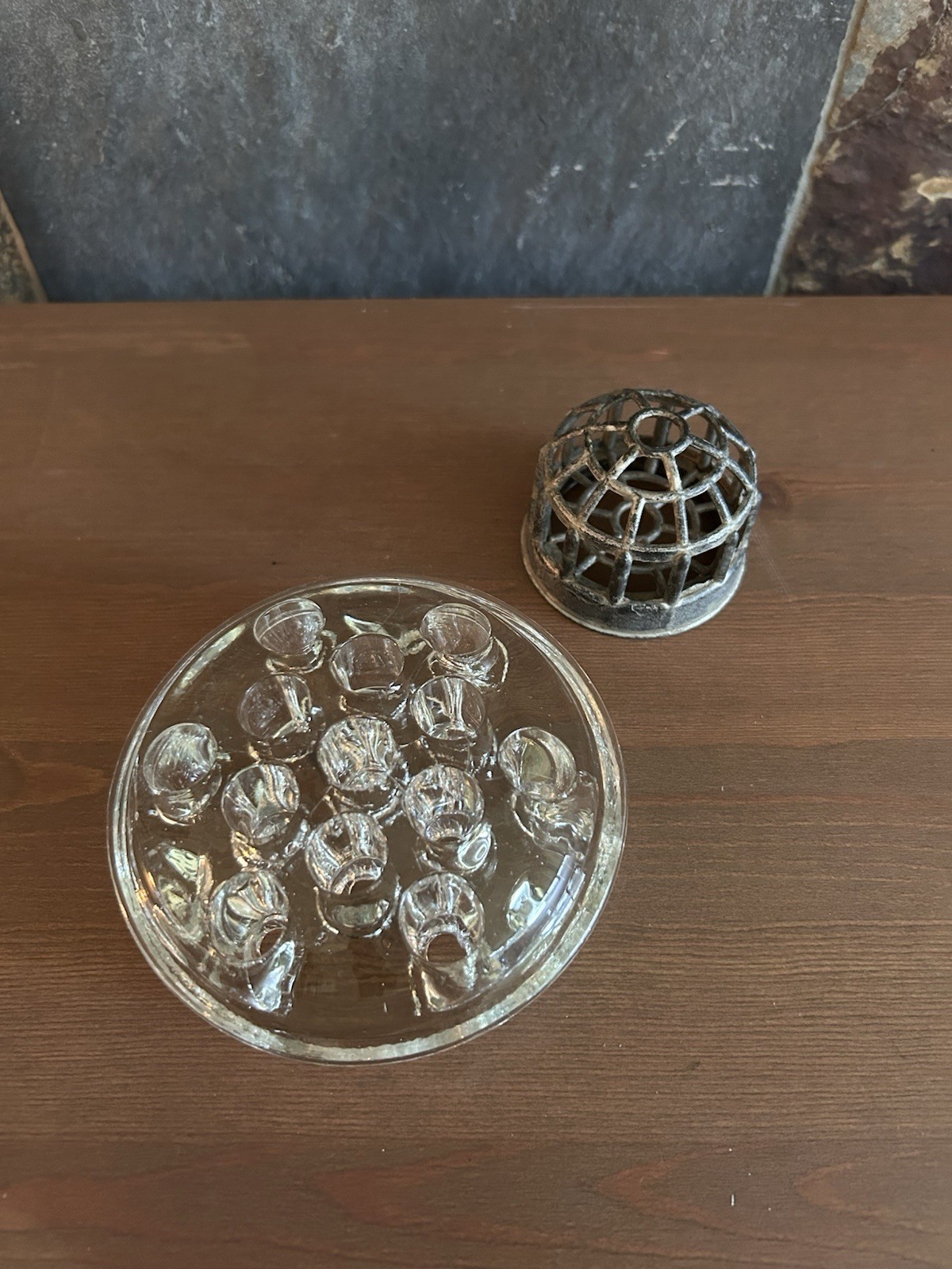 как выглядит Flower Frogs Metal Cage Domed Heavy Glass Vintage Floral Arranging- Set of 2 фото