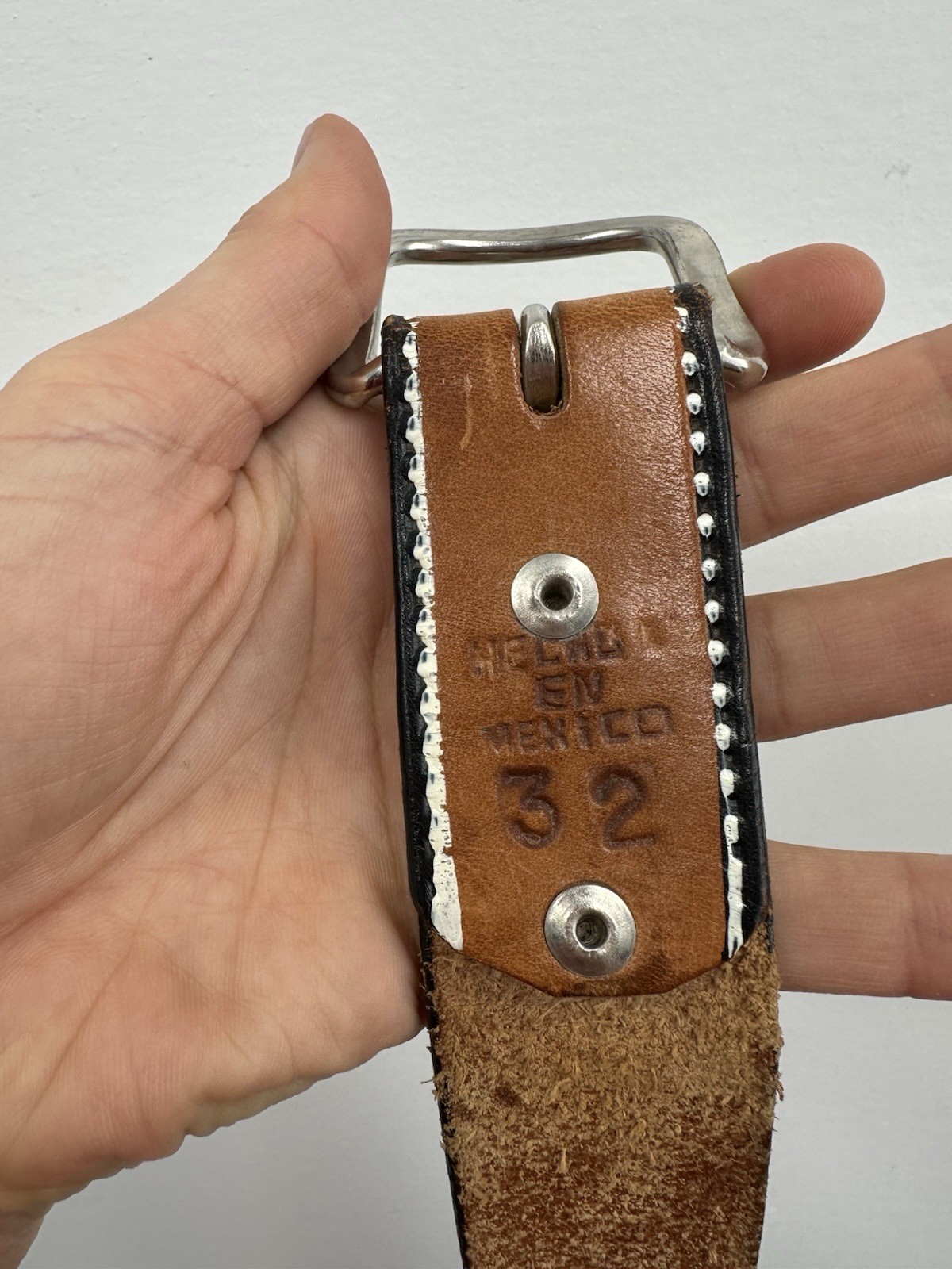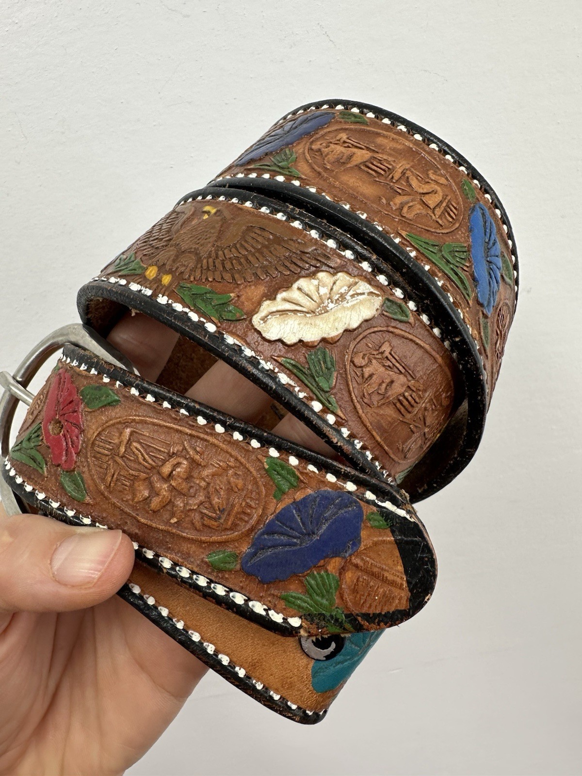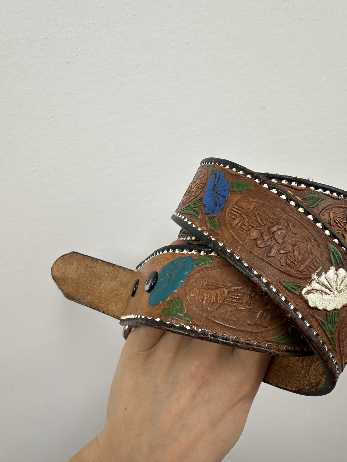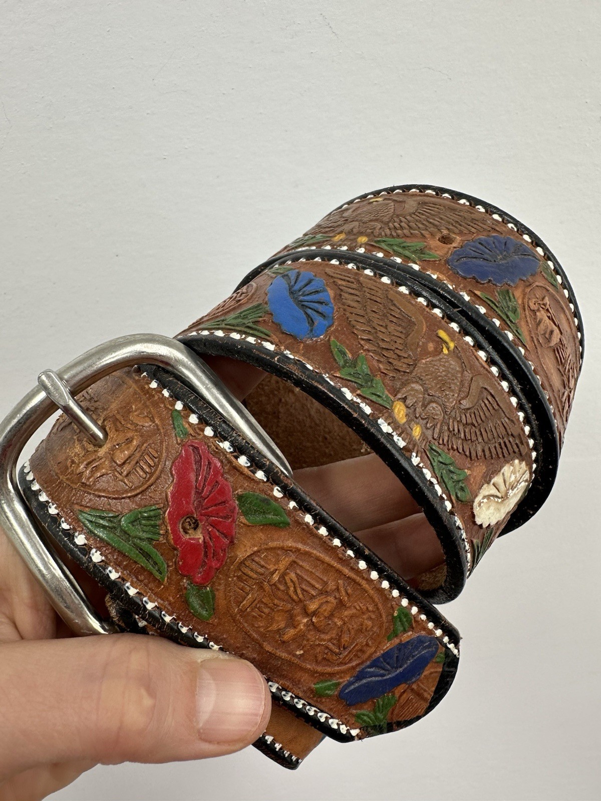 Vintage Western Brown Tooled Leather Belt Made in Mexico Hand Painted Size M