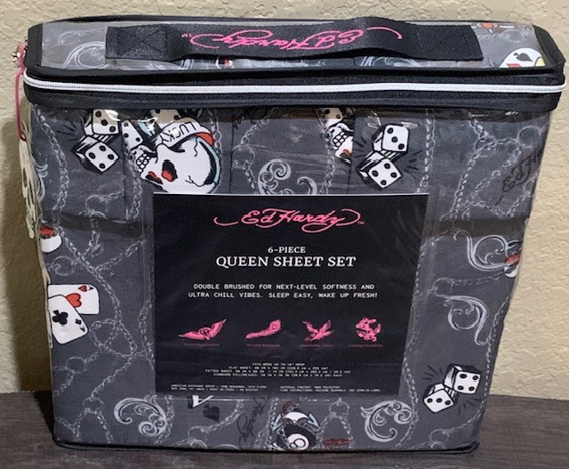 Ed Hardy Grey with Cards,Dice,Lucky Skulls,Logos QUEEN Sheet Set w/4 Pillowcases