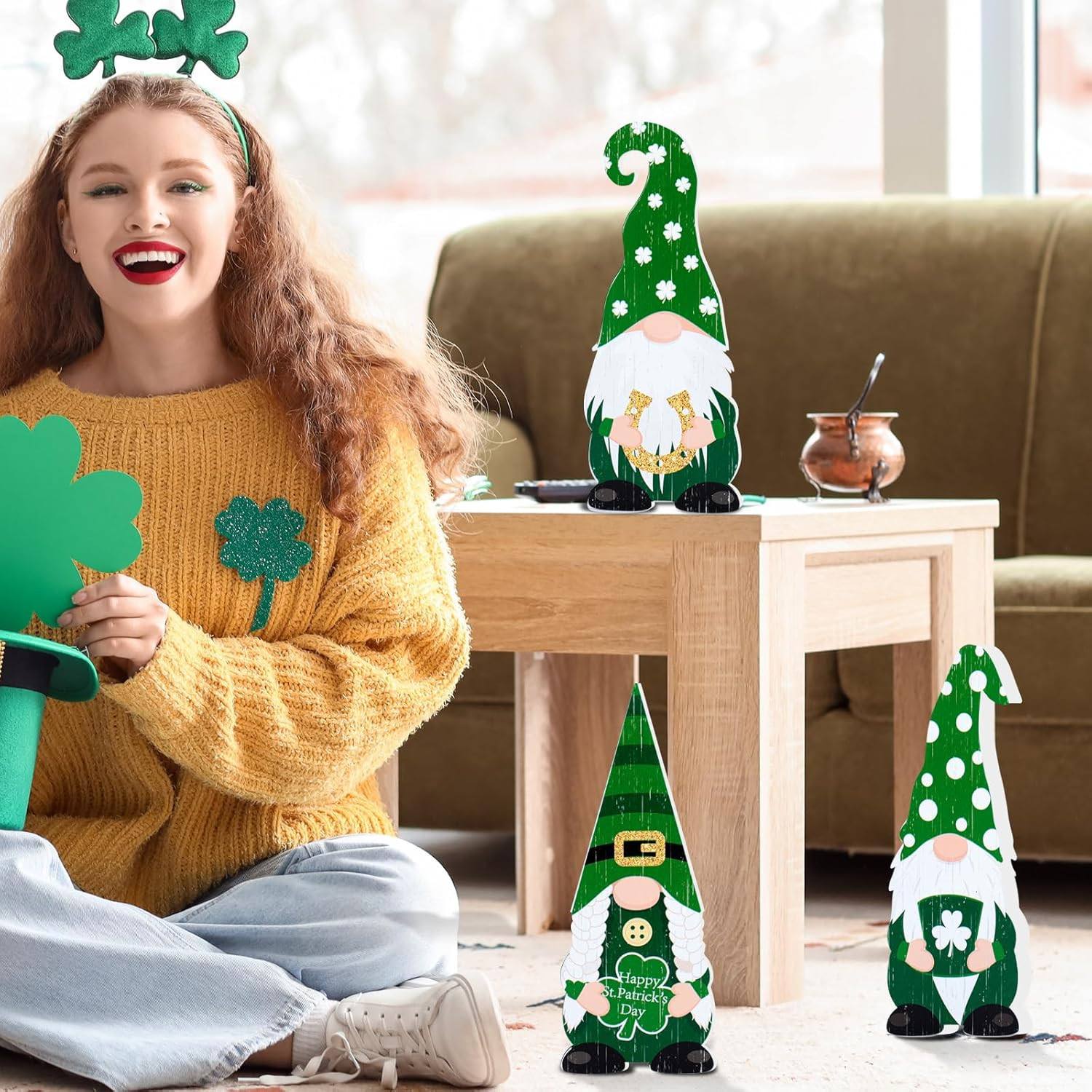 3 Pcs Double Sided St. Patrick'S Day Easter Wooden Gnomes Table Block Sign Dec