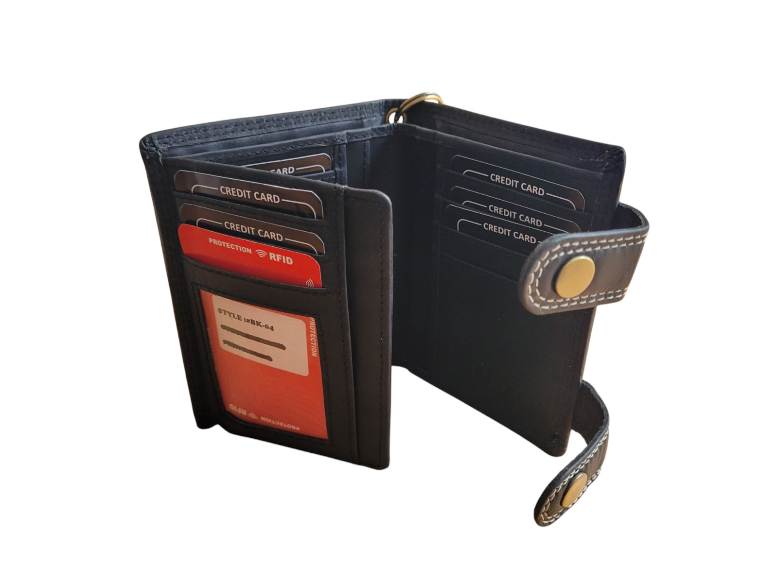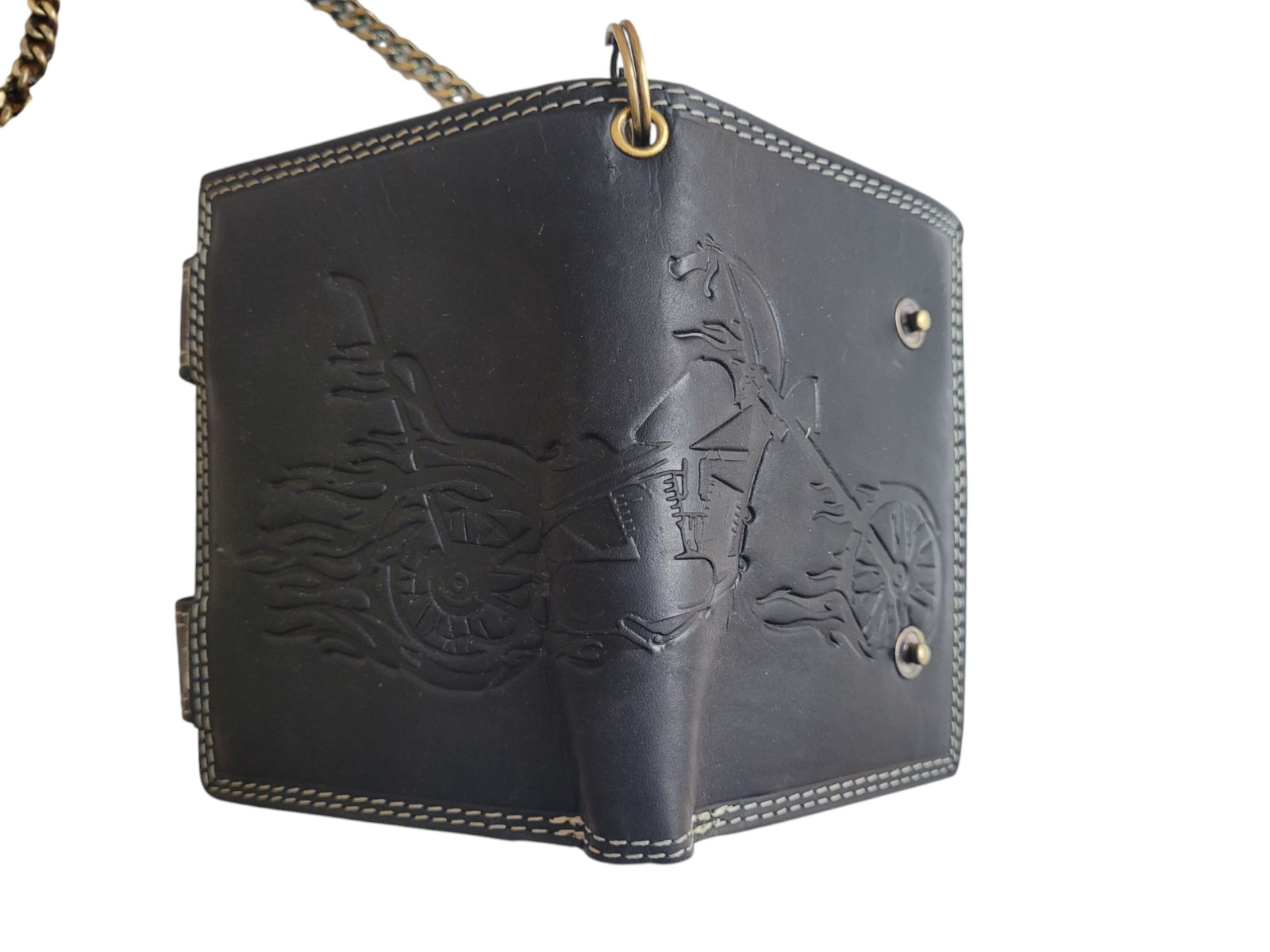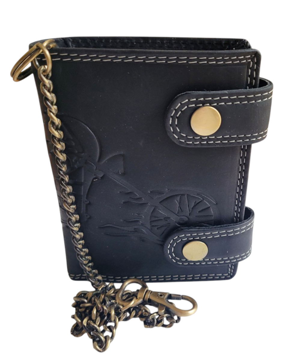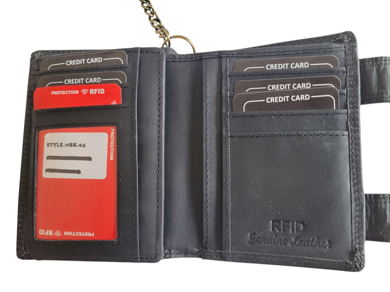 Black Rustic Genuine Leather Biker Bifold RFID Blocking Wallet W/ Chain