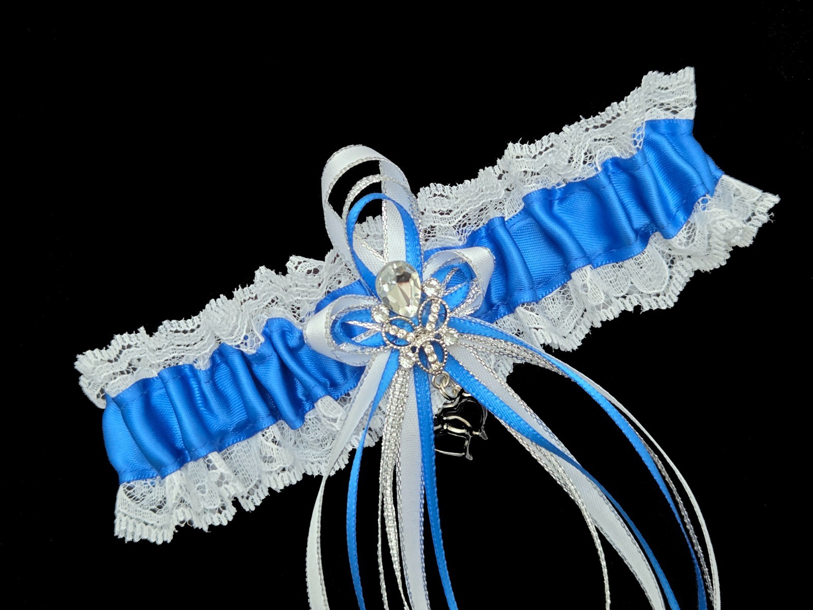Wedding Garter Set Royal Blue White satin lace prom bridal rhinestones toss