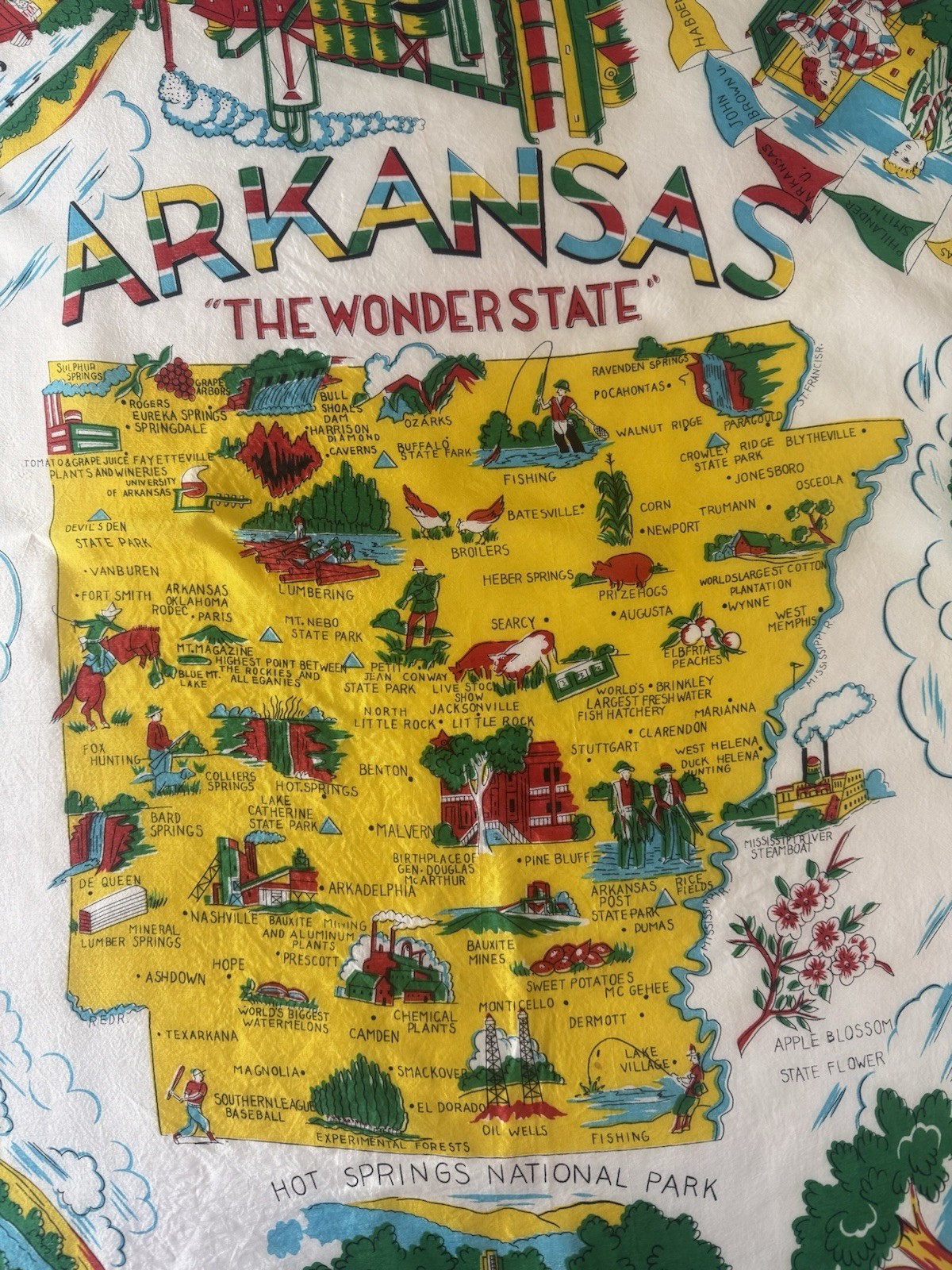 • Vintage Arkansas Map Rayon Scarf Tourist Landmarks Souvenir 28x28 Hand Rolled