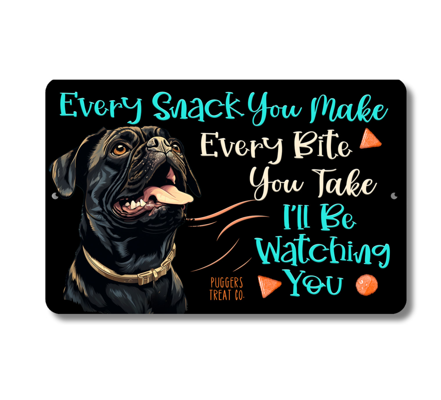 Pug treat sign every snack you make black dog handmade metal tin indoor outdoor