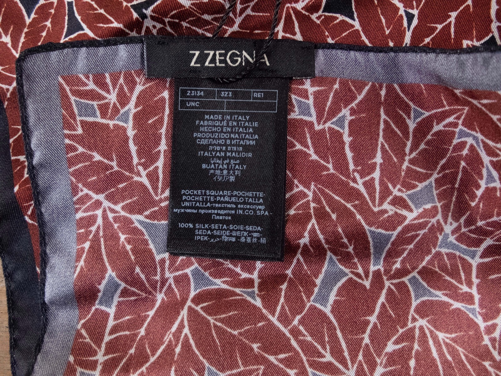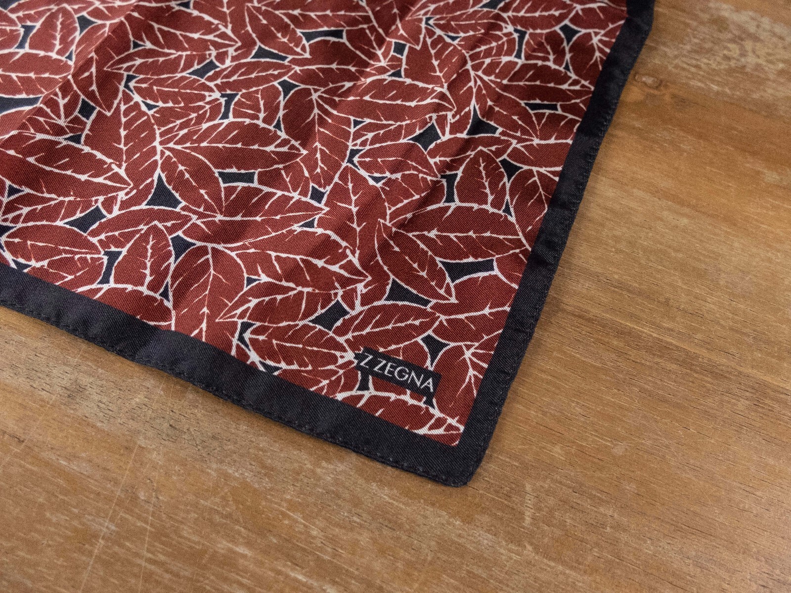 как выглядит NO CUSTOMS TAX Z ZEGNA brown black leaf print silk pocket square authentic фото