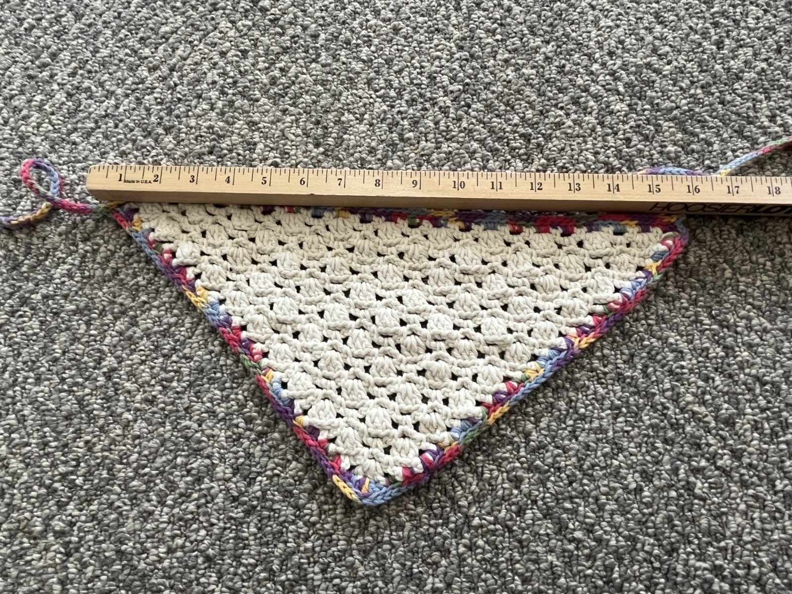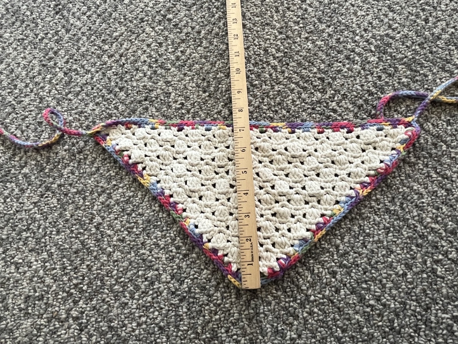 как выглядит vintage handmade multicolor trim triangular head scarf w/ ties, S фото