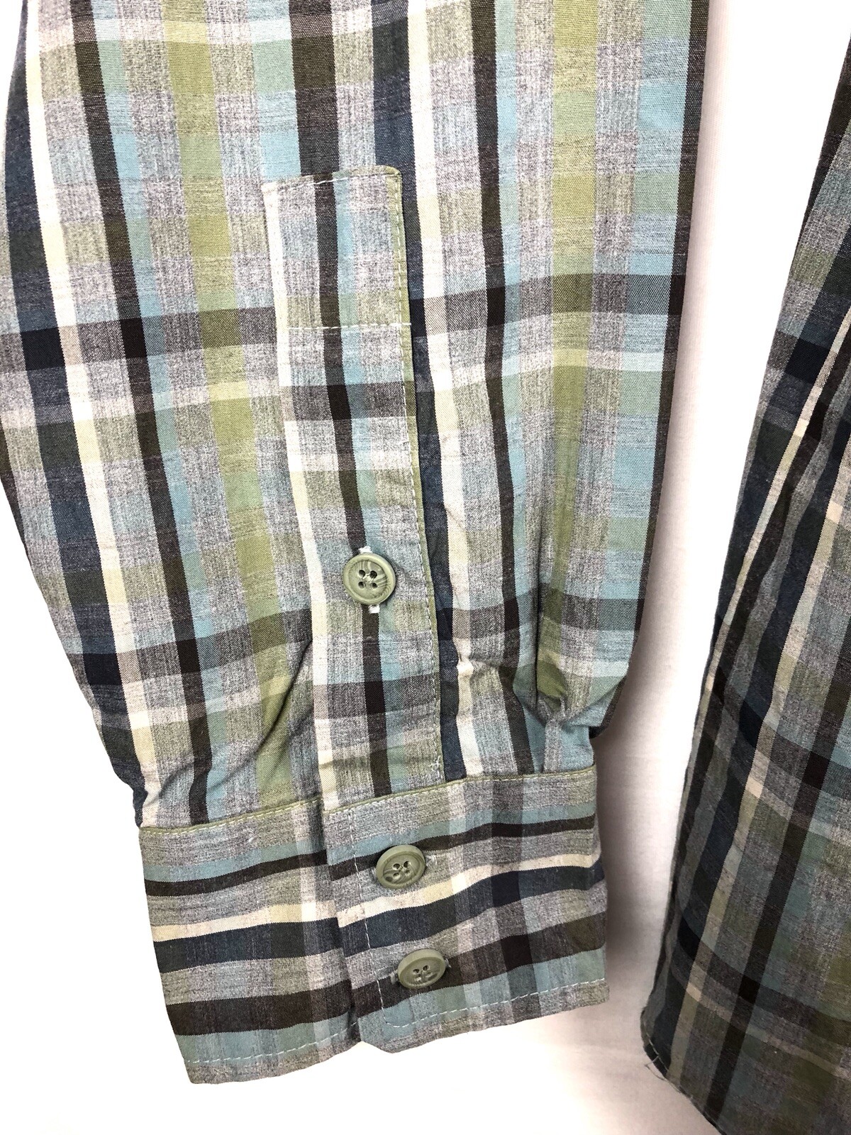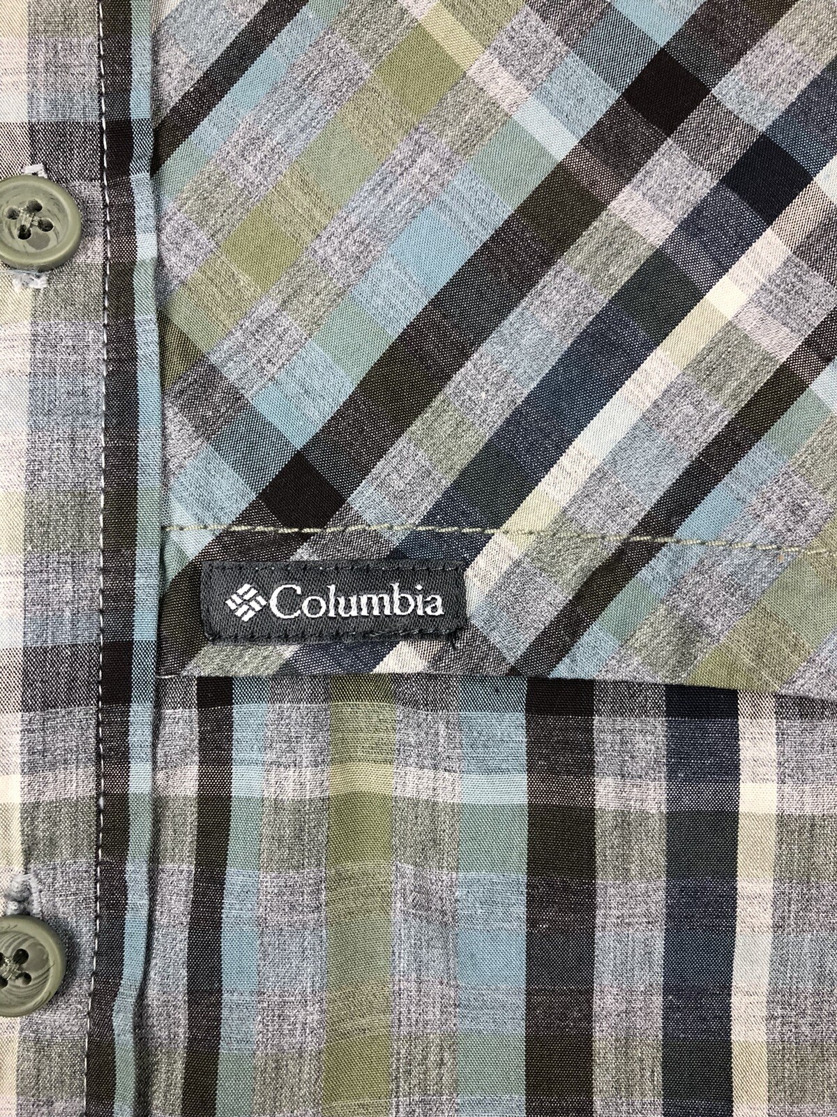 как выглядит COLUMBIA Mens L/S Button Up Shirt Size L Front Pocket Plaid Grey/Blue EUC фото