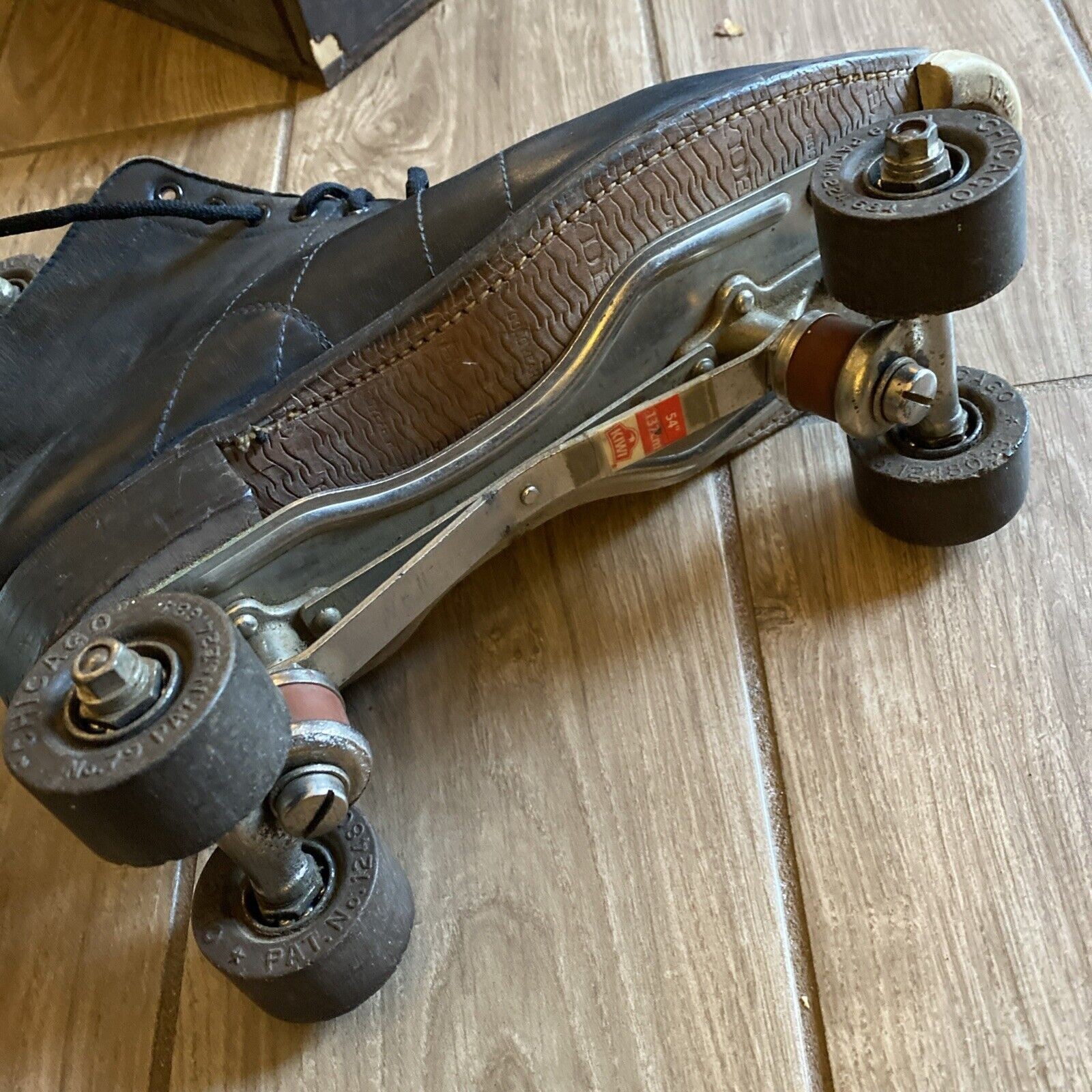 Vintage Hyde Black Leather Roller Skates Men's Size 10.5 With Wooden Case