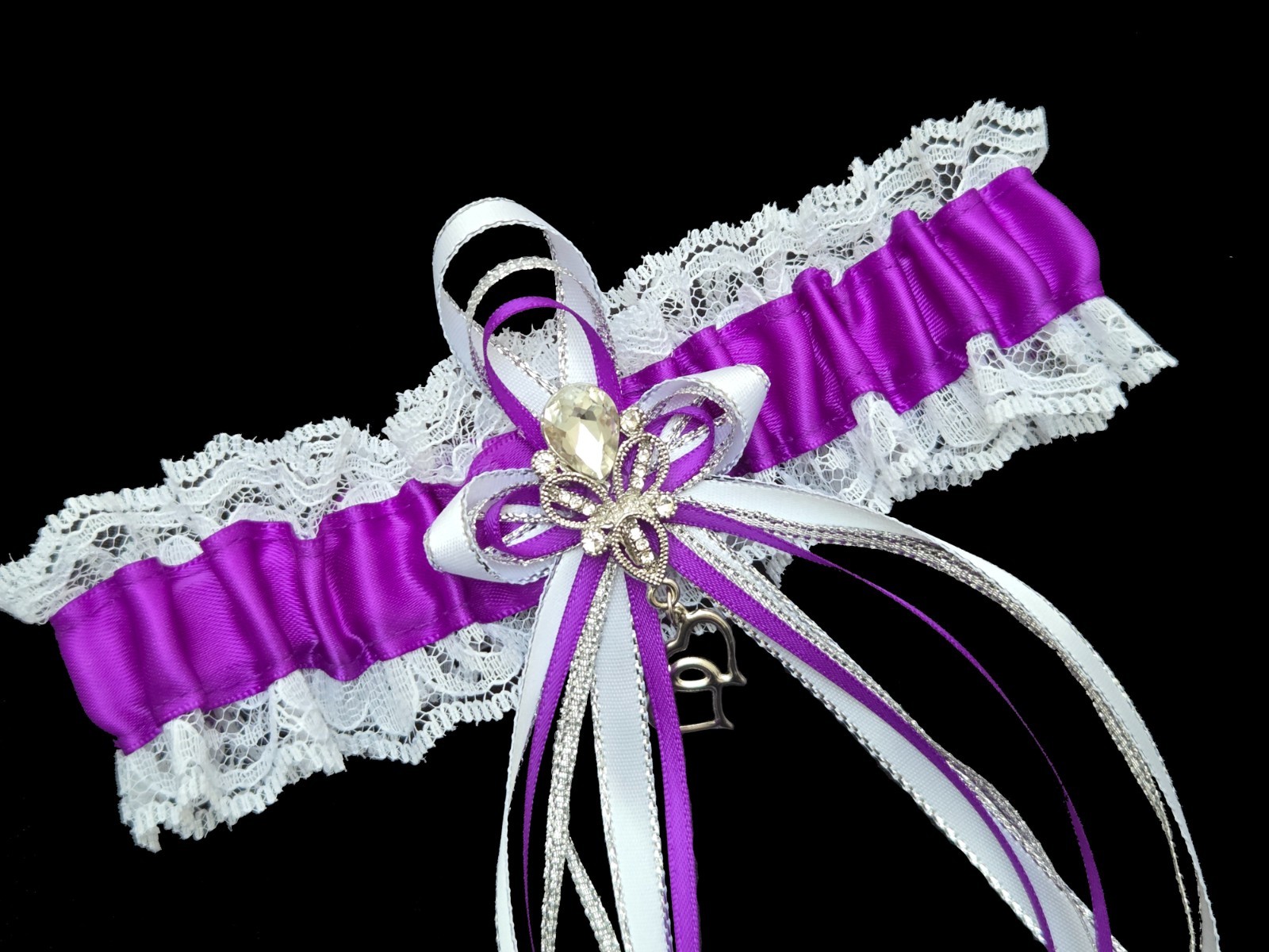 как выглядит Wedding Garter Set Purple White Lace Satin Prom Bridal Rhinestones Toss фото
