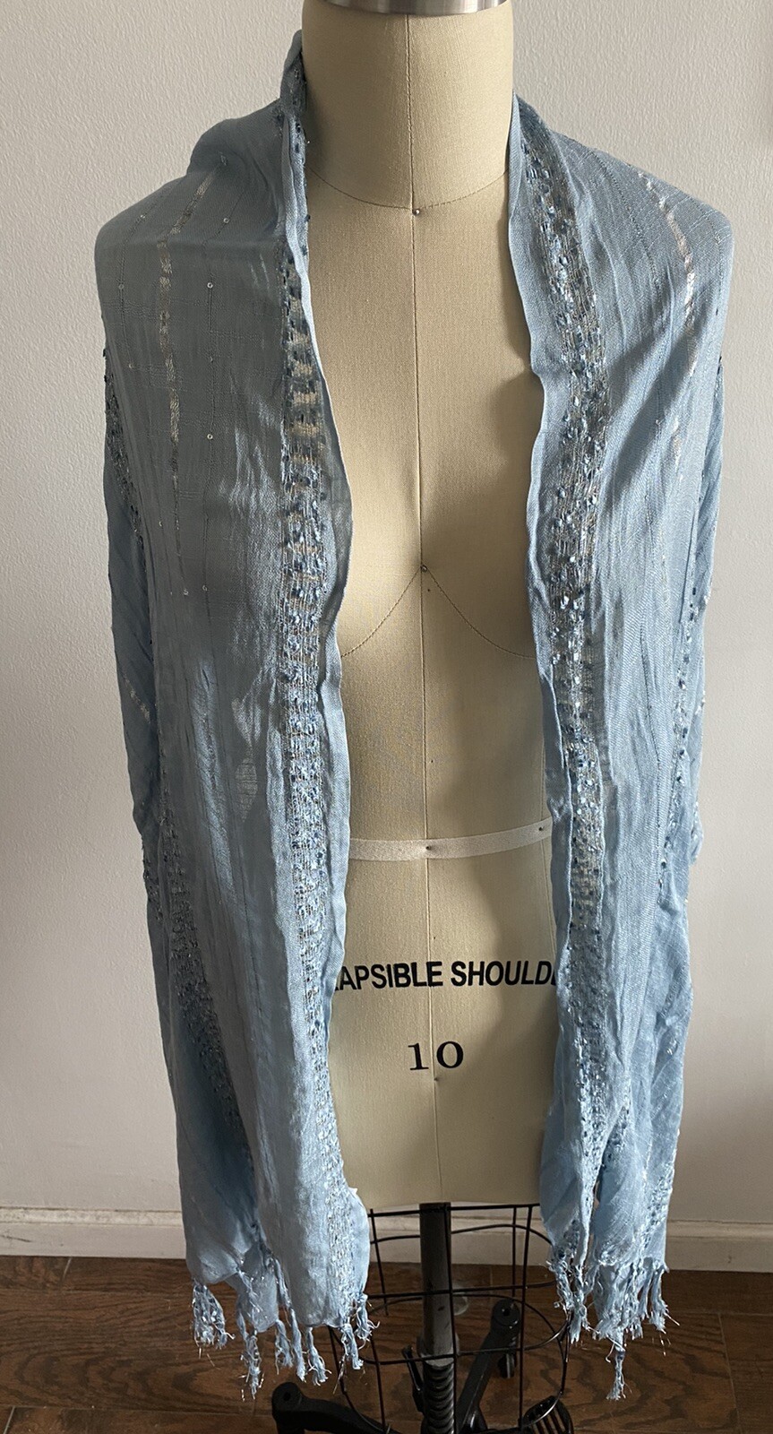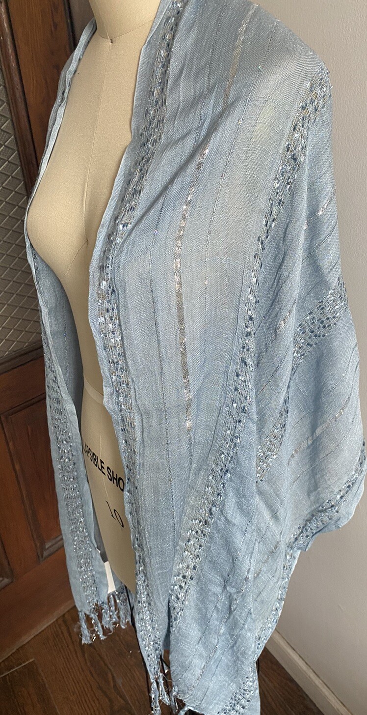 NWT Scarf, Shawl Baby Blue Silver Metallic Thread Fringe Tan s Brand 23 X 75