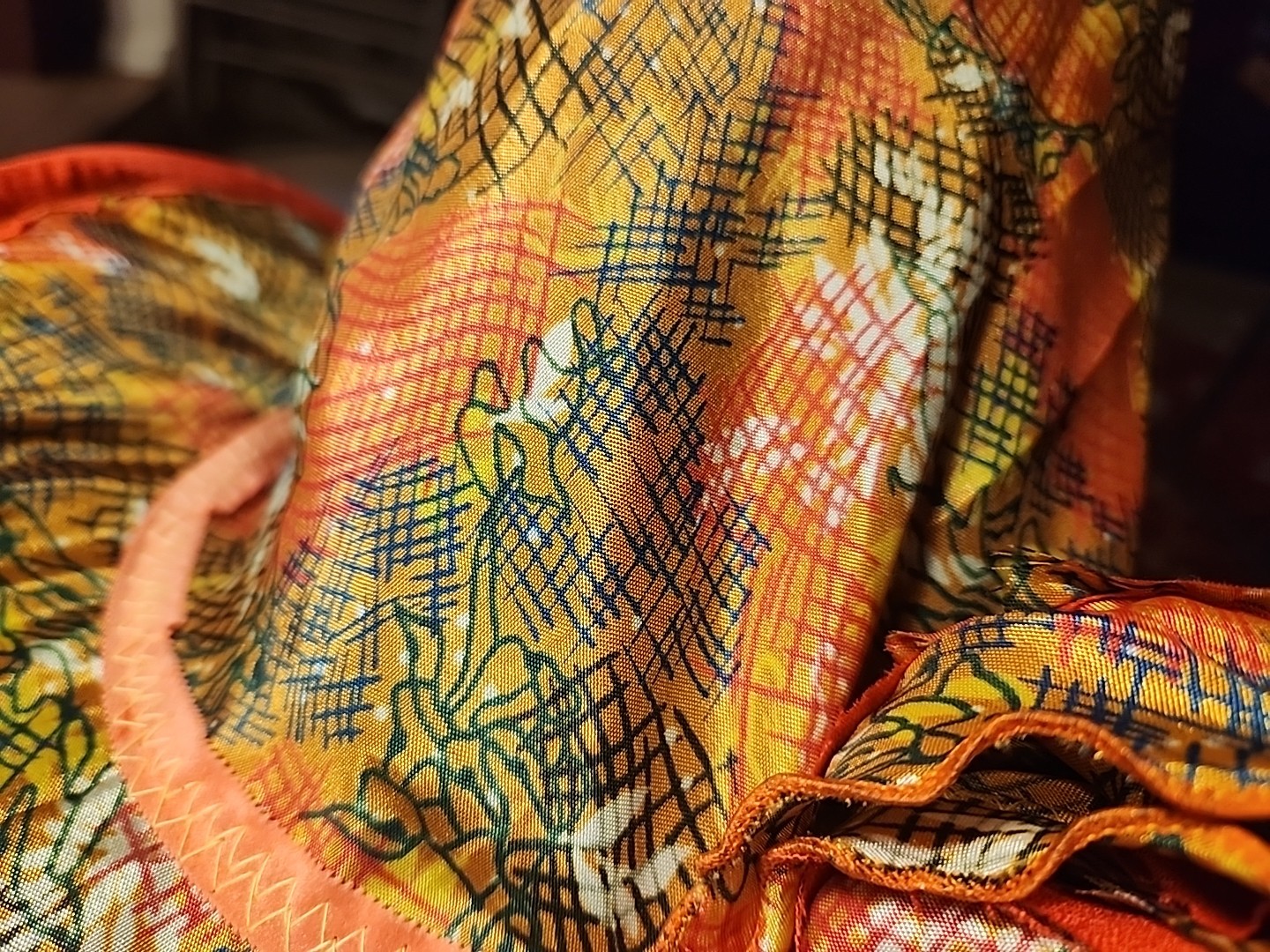 как выглядит Bespoke Witch Hat OOAK Orange Tan Green Print Poppy Orange Lining Wire Brim фото