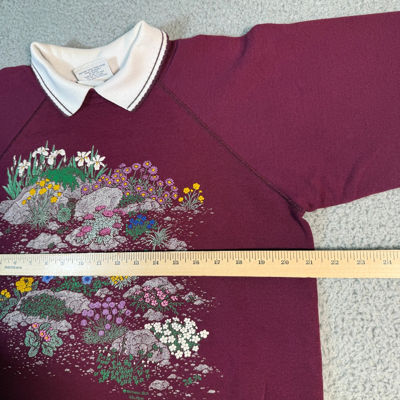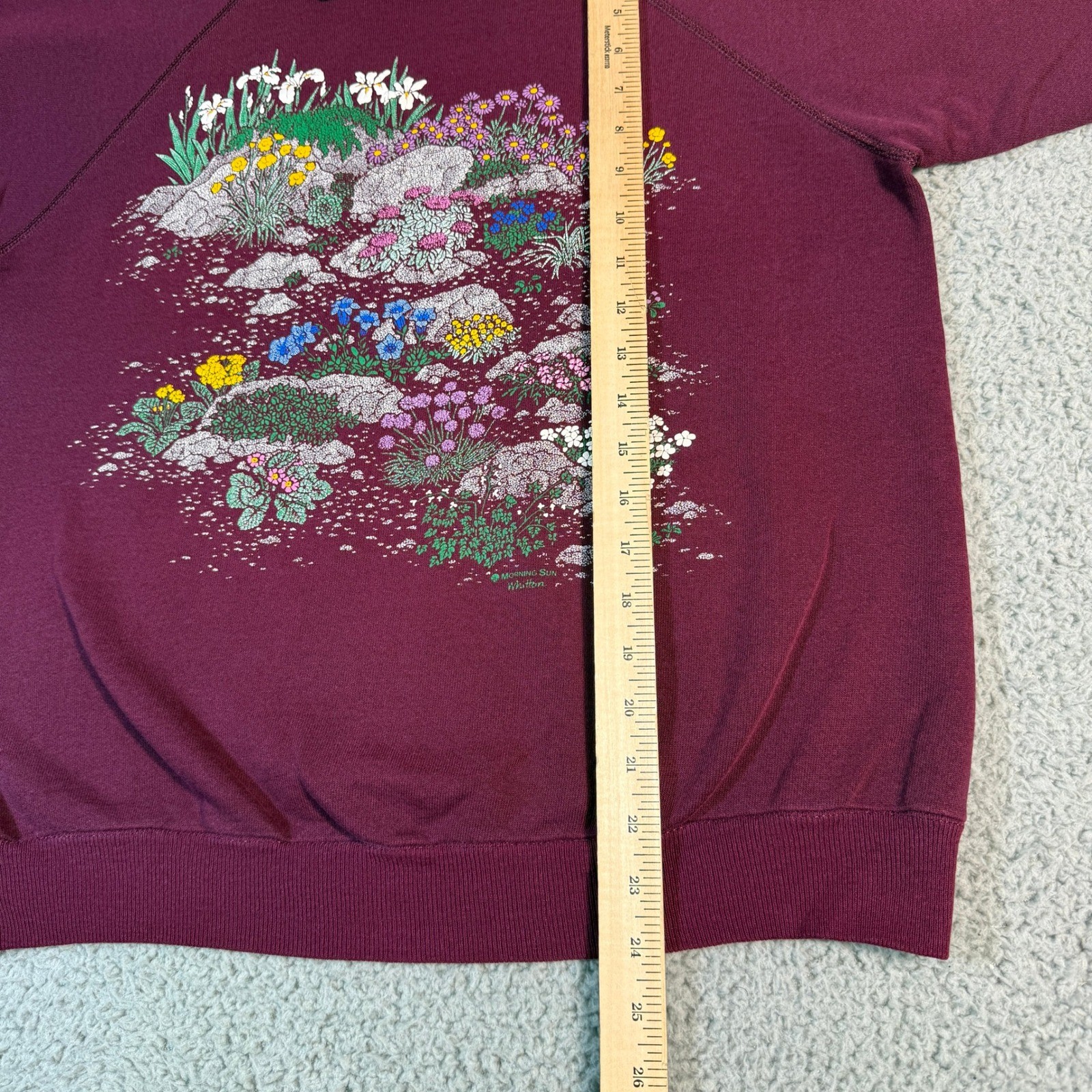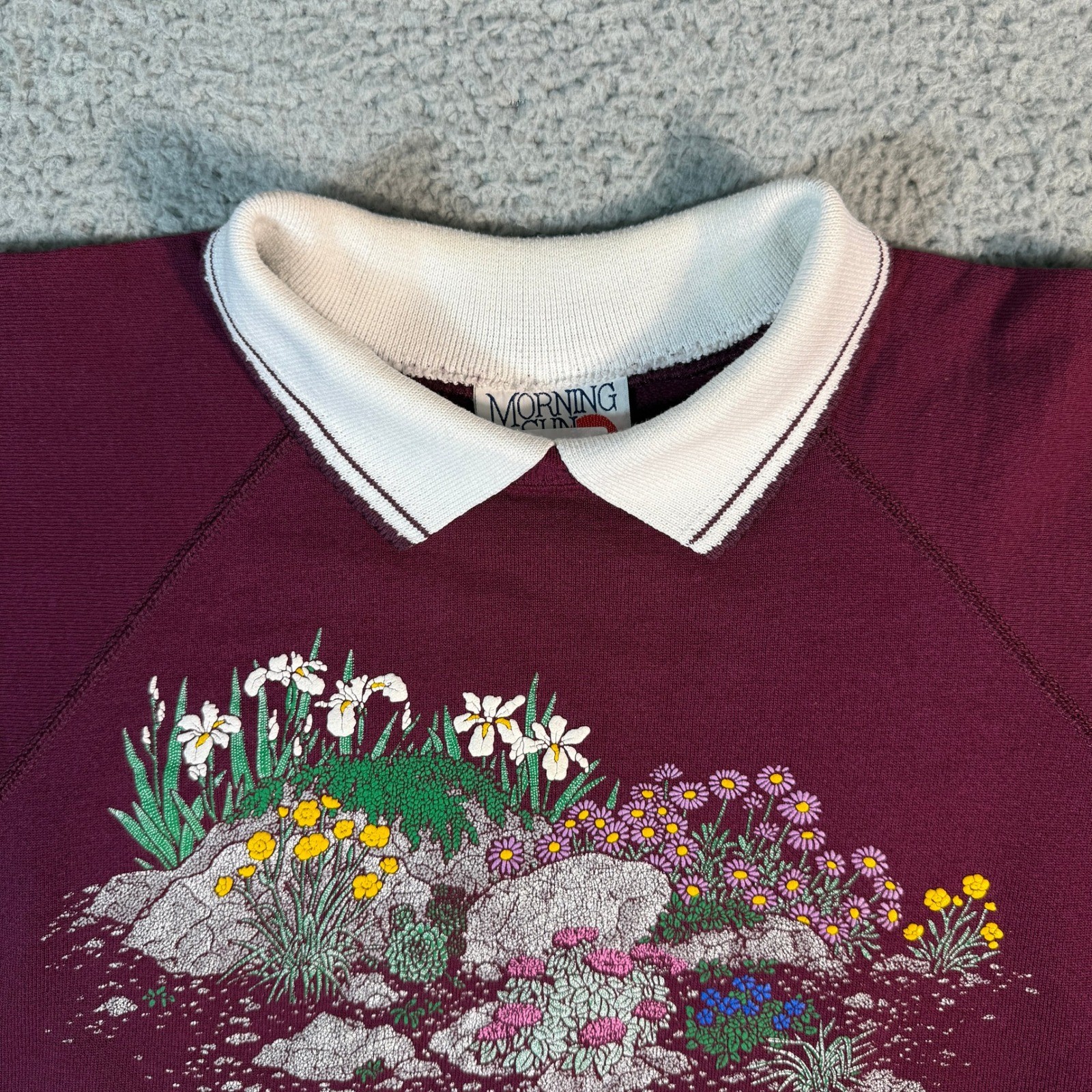 Vintage Morning Sun Sweatshirt Size Large Collard Floral Graphic Print Maroon