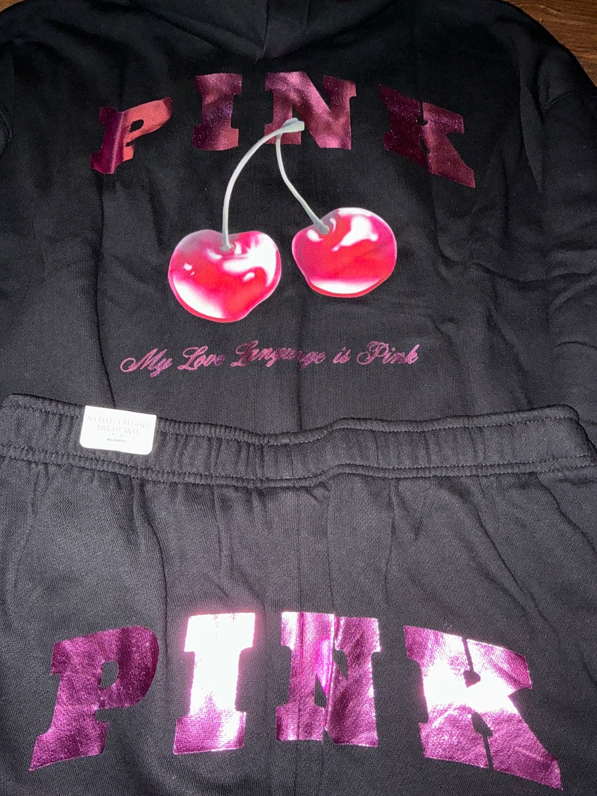 как выглядит Victorias Secret Pink Bling Campus FZ Hoodie Pants Set Black Red Cherry L NWT фото