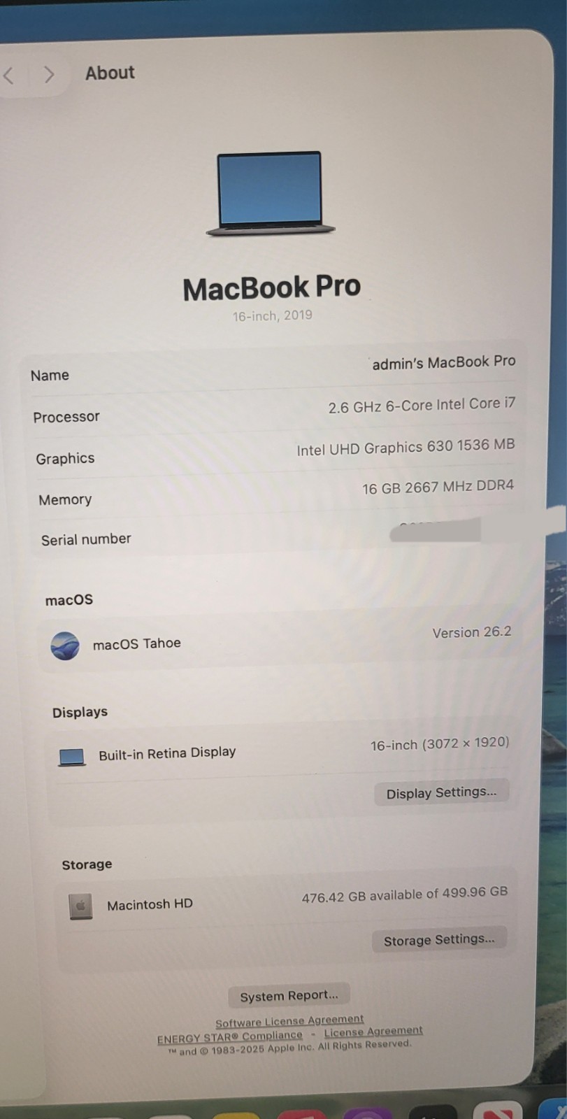Apple MacBook Pro A2141 - 16 Intel i7 2.6GHz, 16GB RAM 500 GB SSD 2019