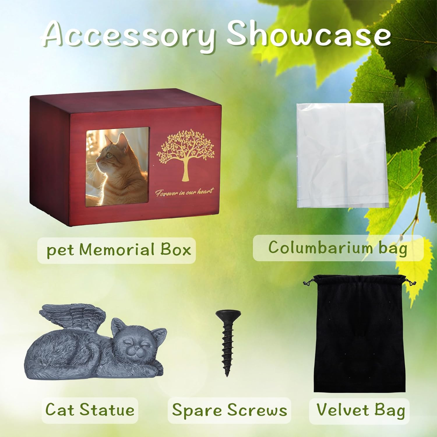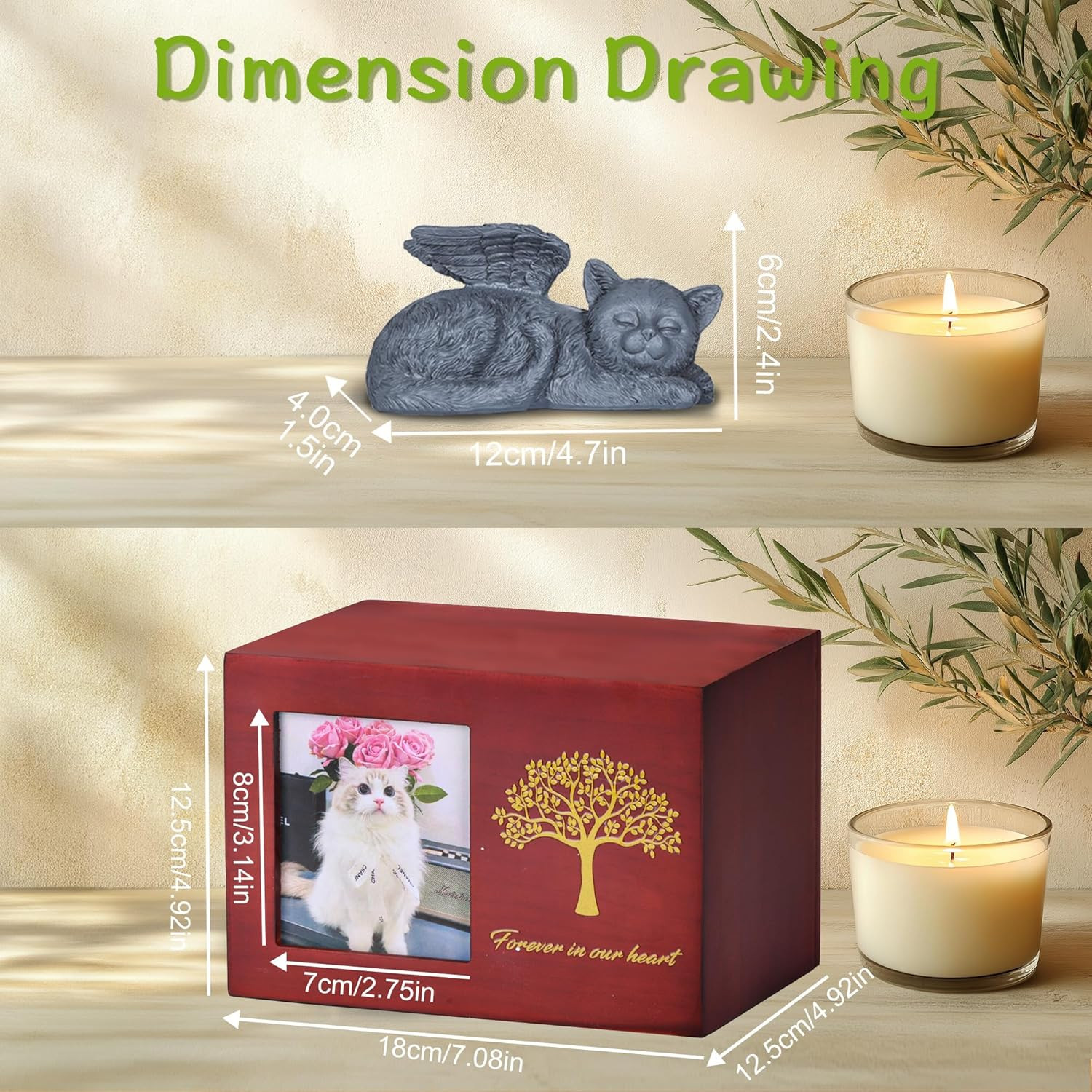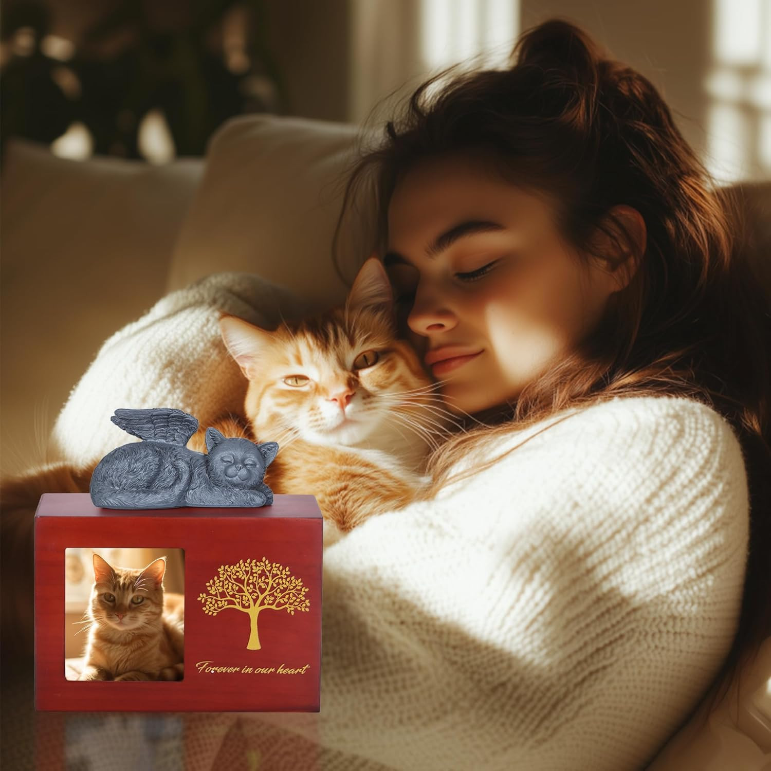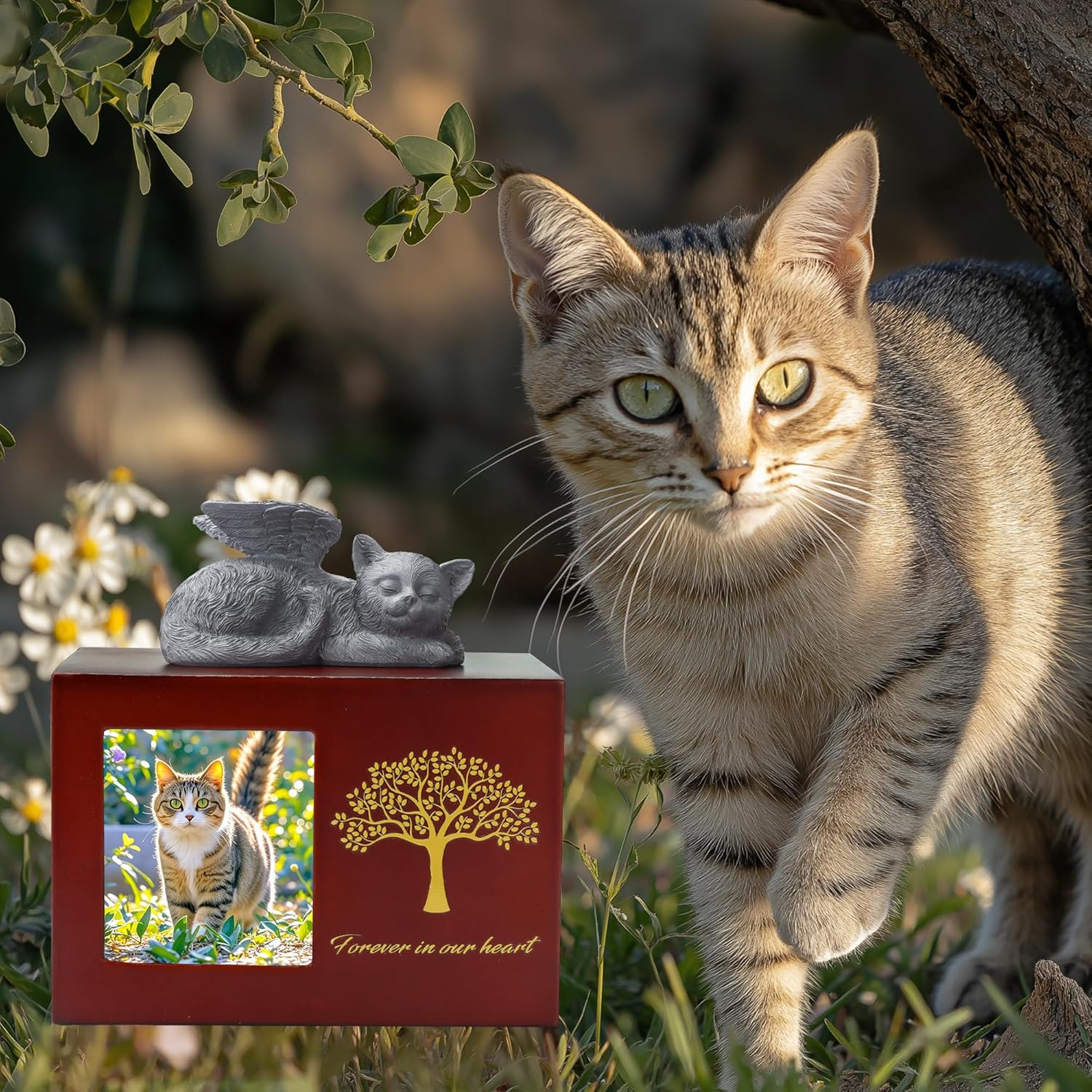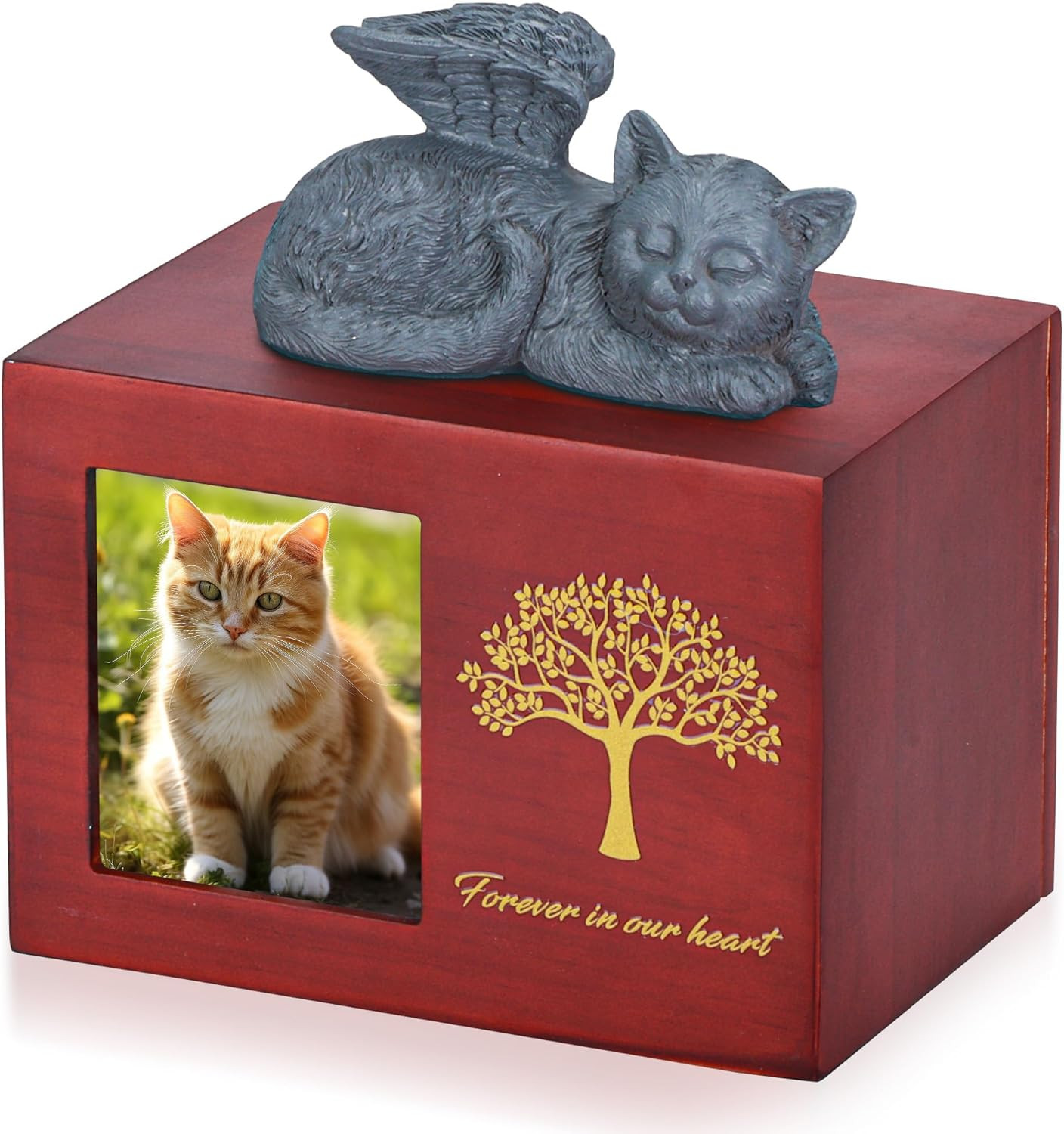 Pet Urn for Cat Ashes, Tree Pattern Wooden Keepsake with Photo Frame, Memory Box