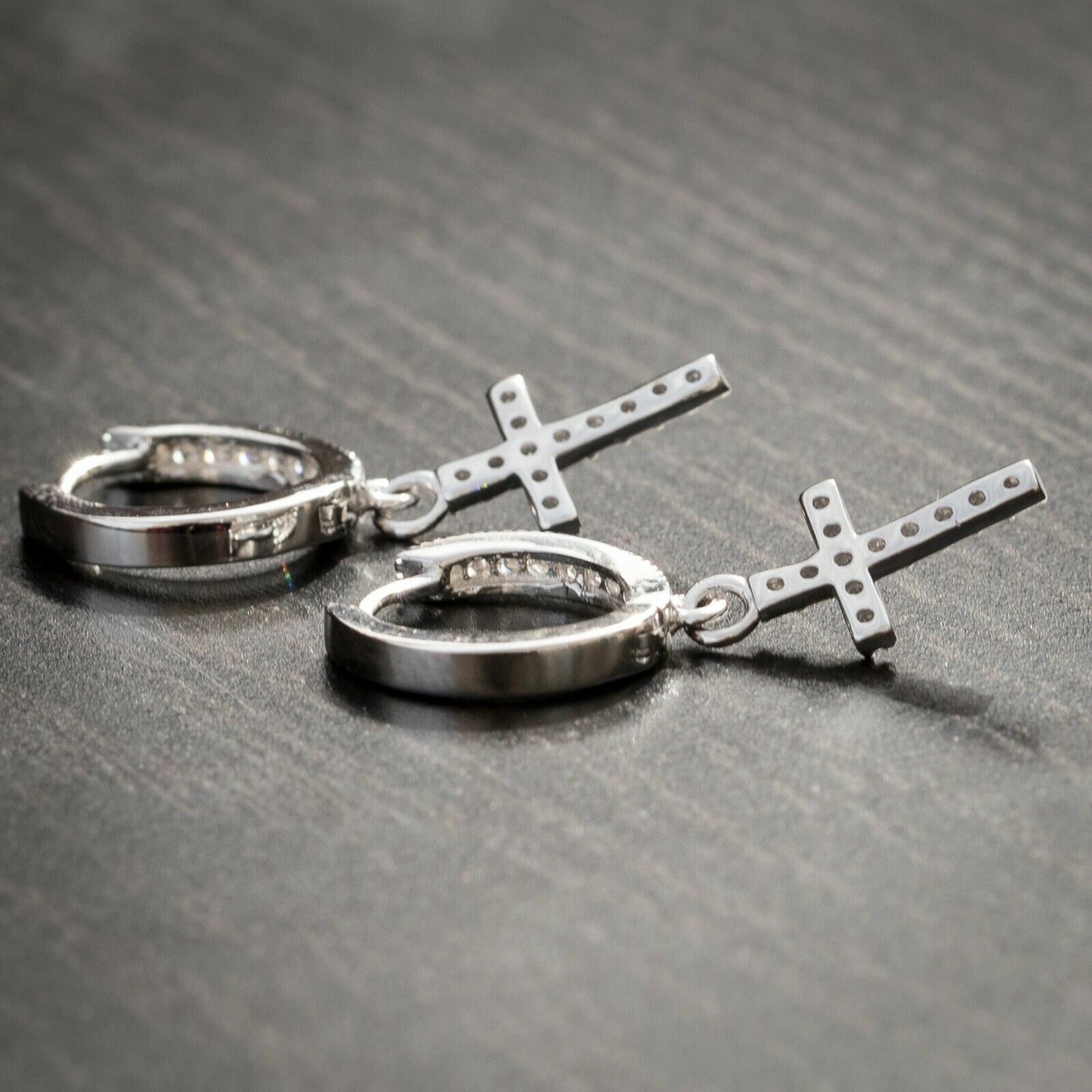 Sterling Silver Simulated Diamond Small Cross Dangle Huggie Earrings For Men