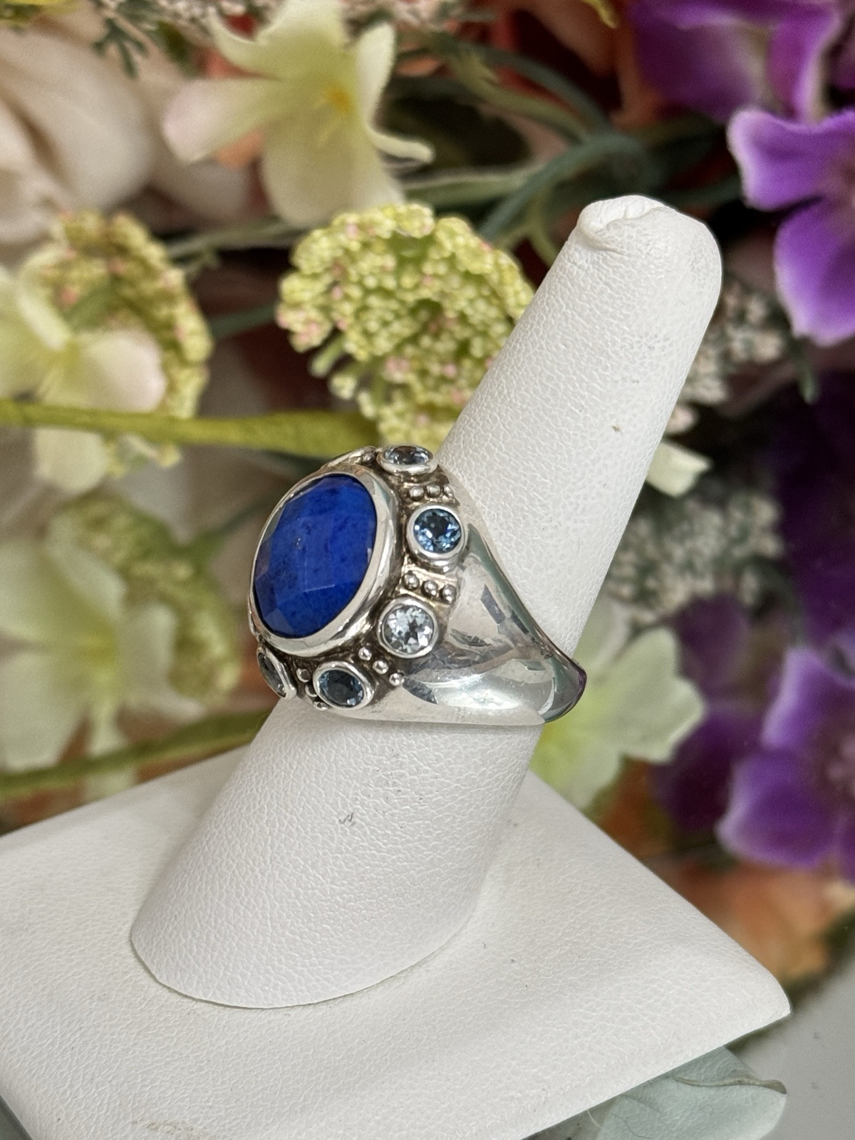 Sterling Silver Ladies Blue Lapis Lazuli Blue Topaz Artisan Dome Ring Size 7