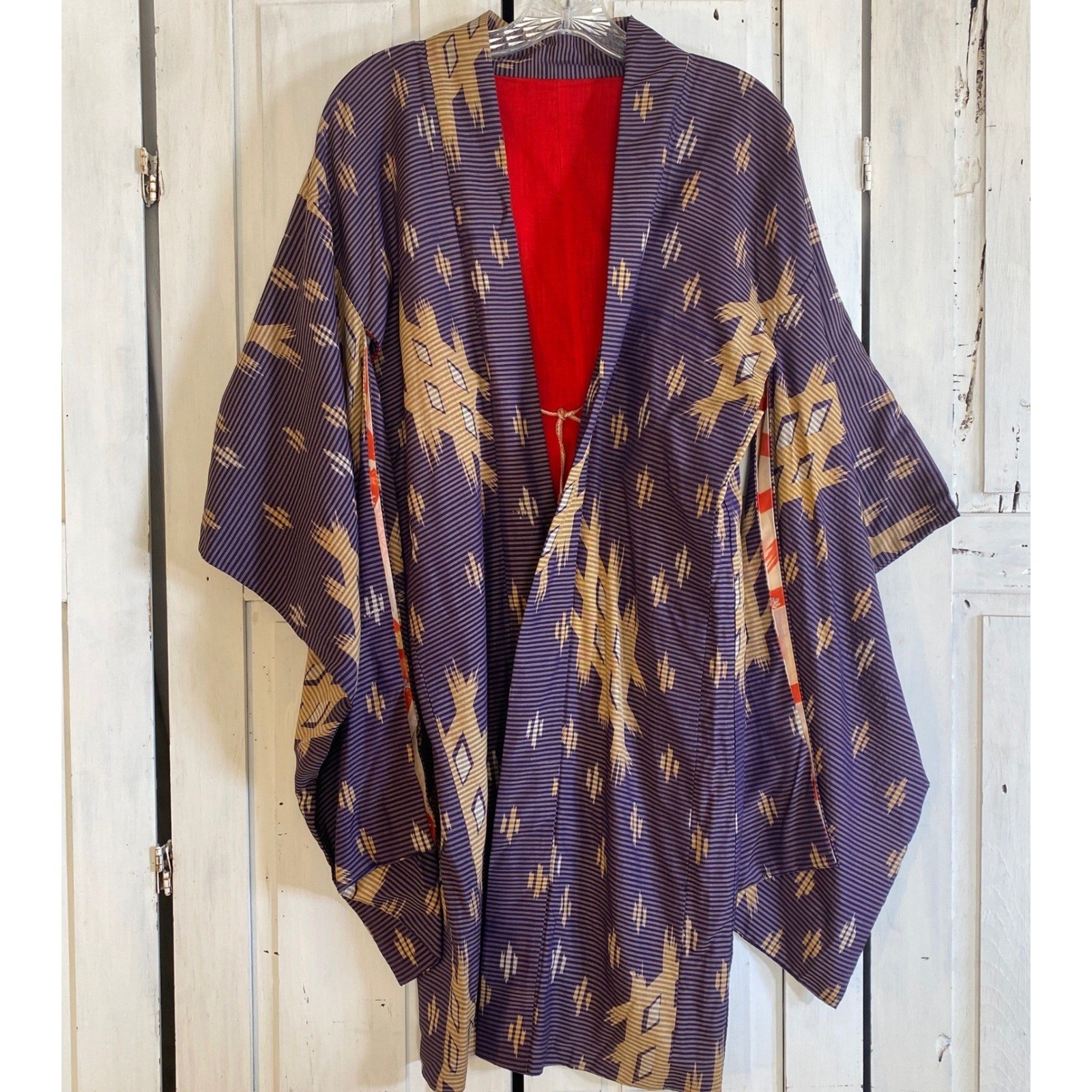 как выглядит Vintage Japanese Haori Kimono Jacket Purple Gold Ikat Kasuri Silk Red Lining фото