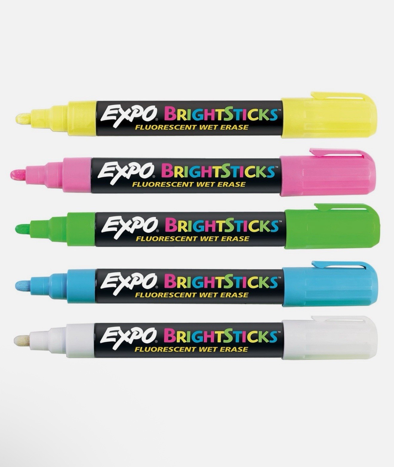 Bright Sticks Wet Erase Fluorescent Markers, Bullet Tip, Assorted Colors, 5