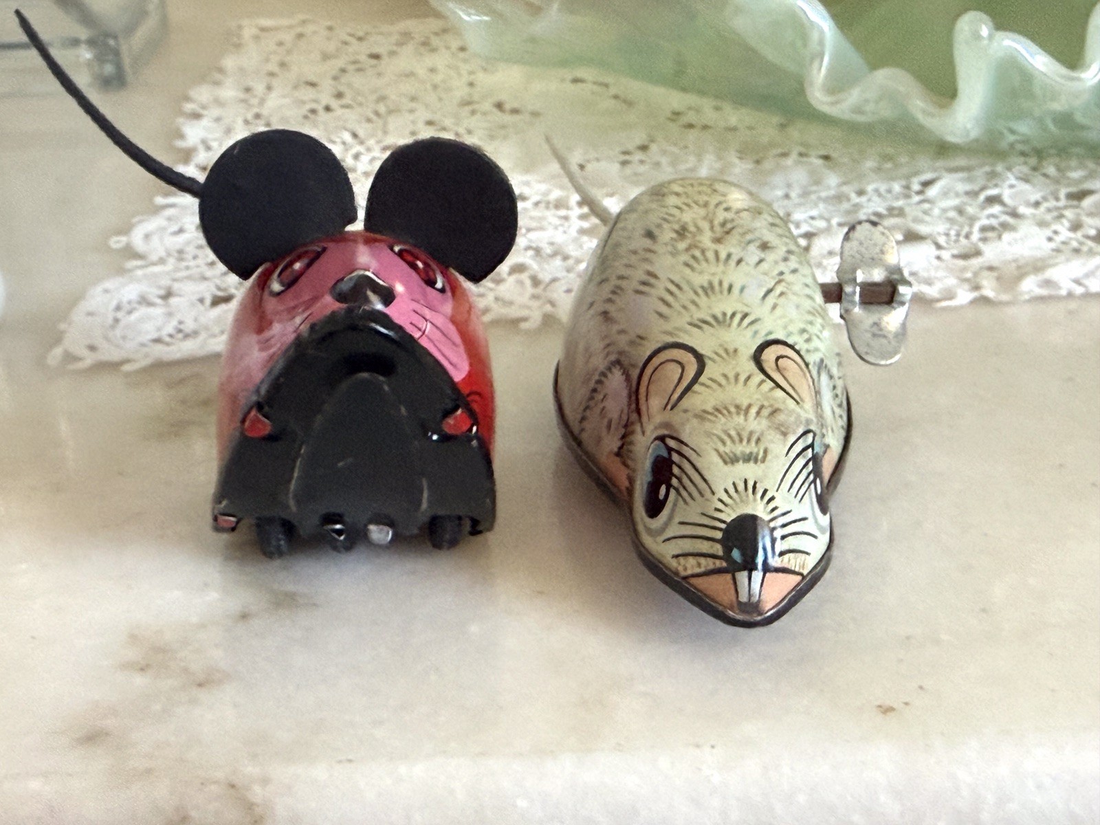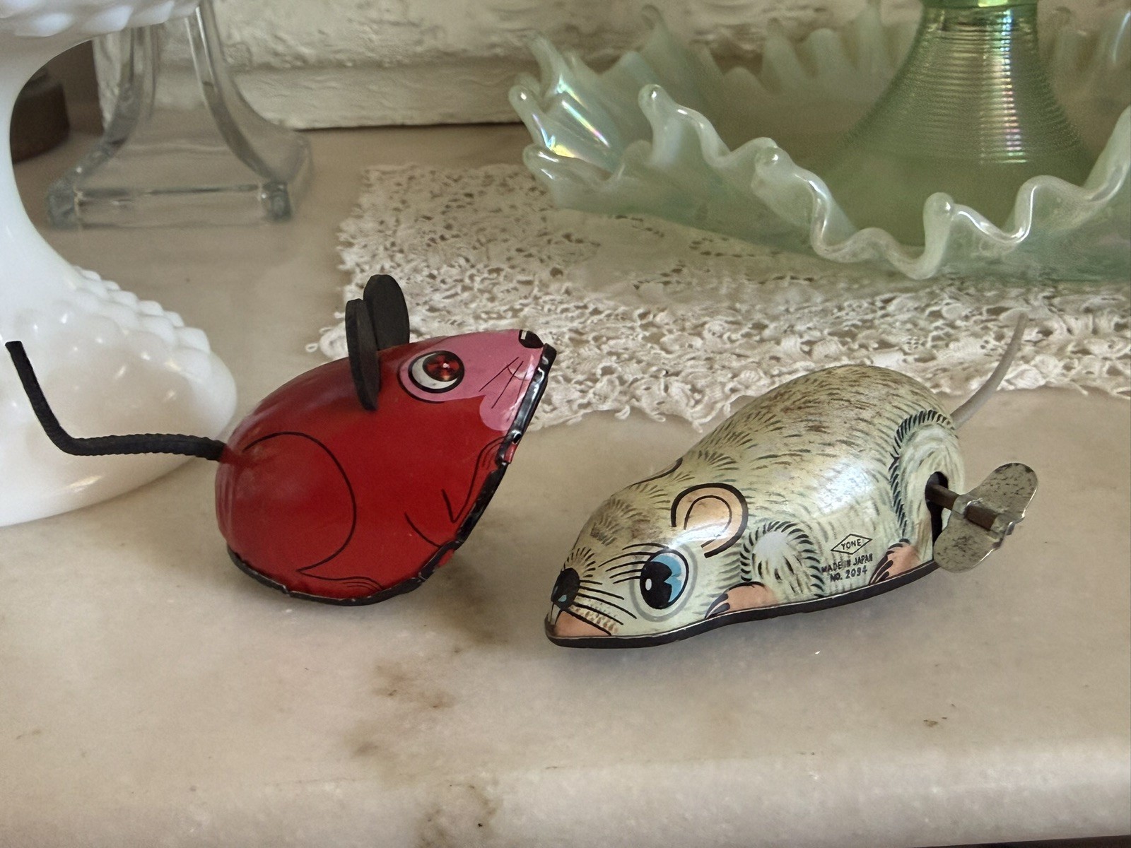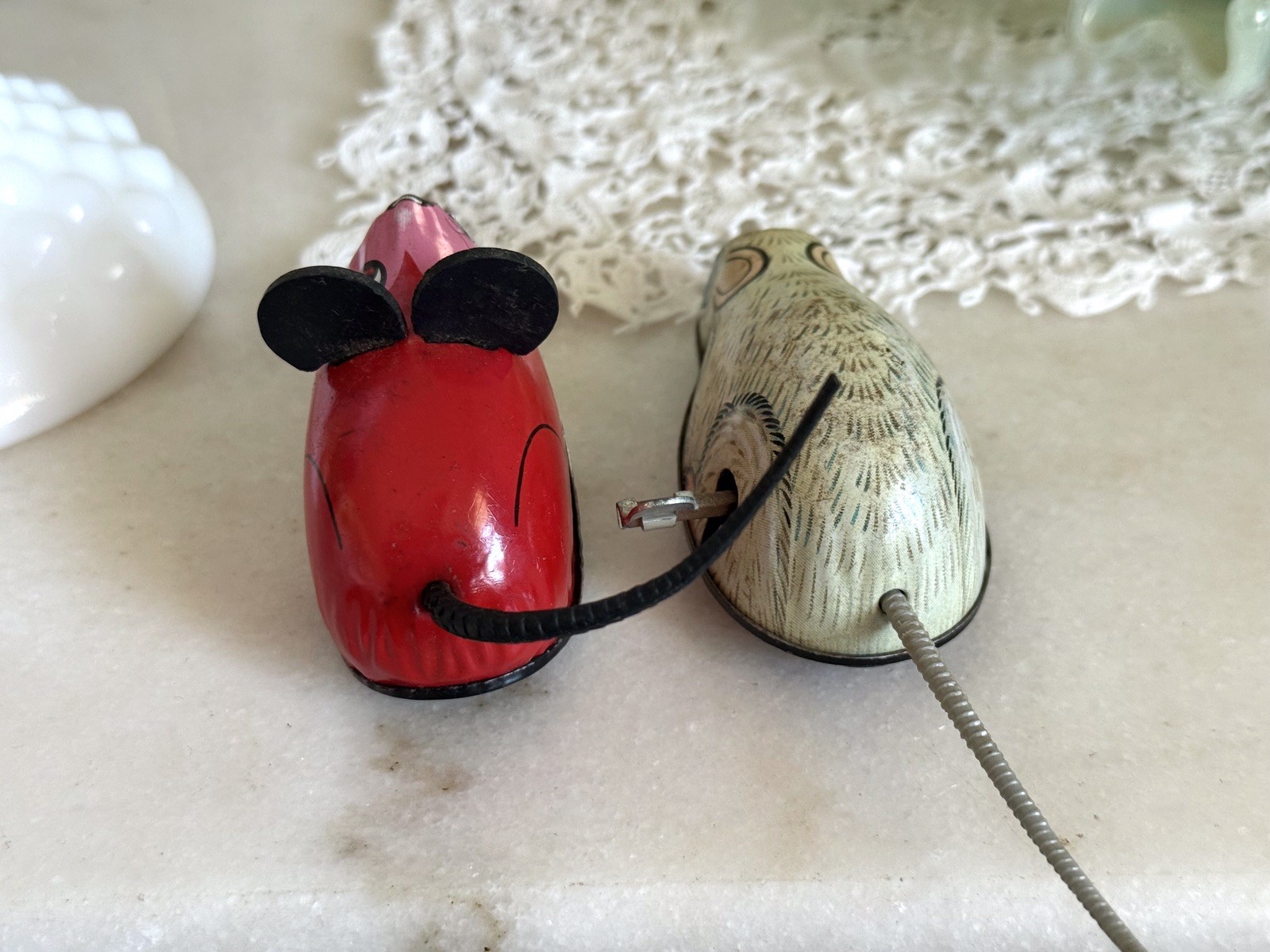 Vtg Set 2 Kinzoku K Tone Metal Tin Litho Toys Red Mouse Cream Mouse