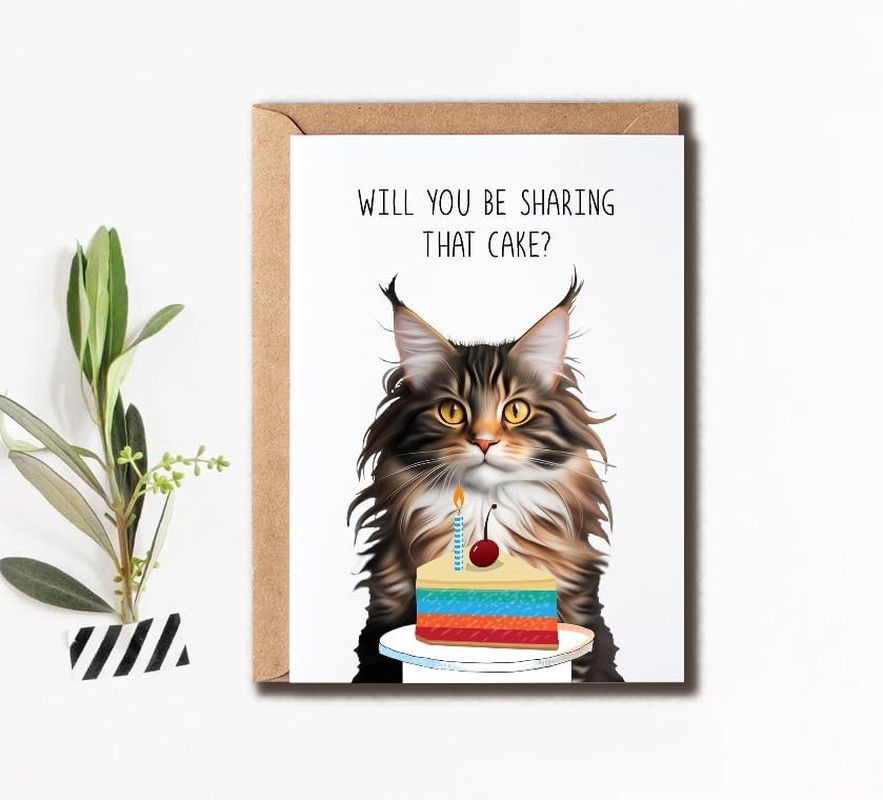 Fun Maine Coon Birthday Cake Card - Will You Be Sharing That Cake - Lovely Maine