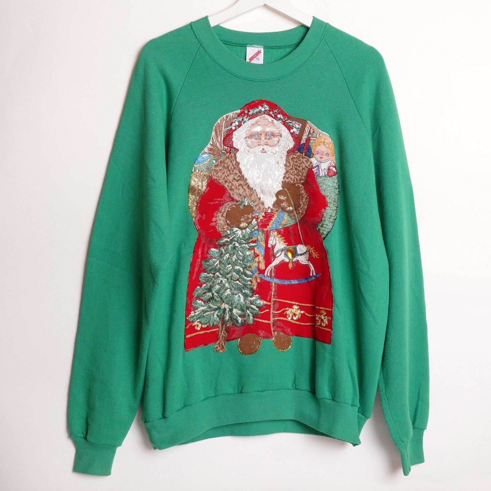 Vintage 80s Holiday Santa Sweatshirt Men s Large FIT Raglan Made In USA Ugly