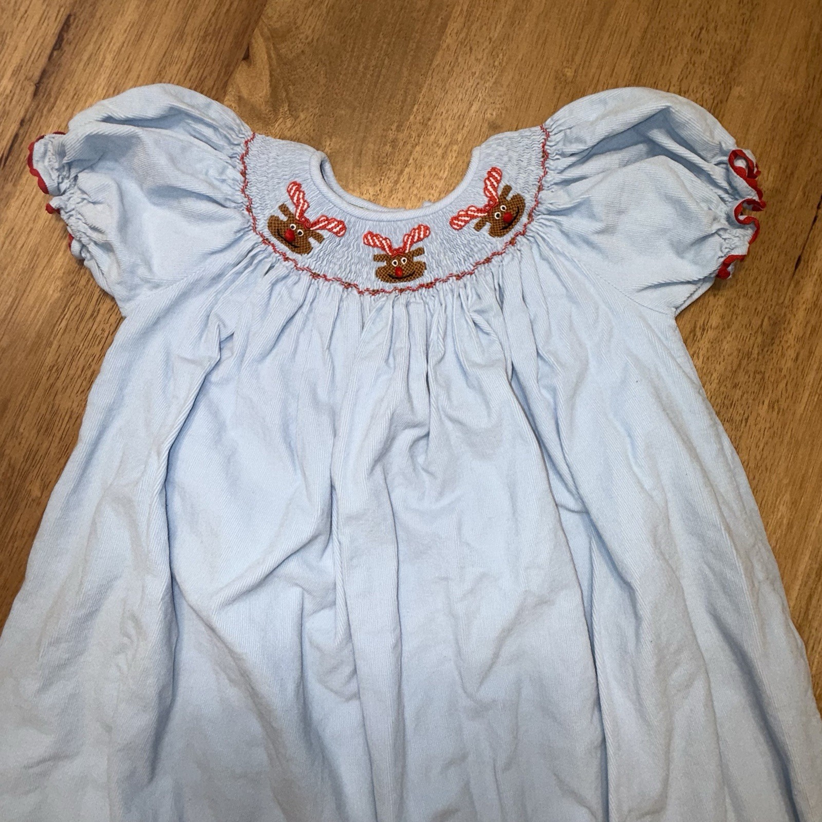 как выглядит Smocked Reindeer Rudolph Dress Girls Sz 6 Blue Corduroy Red Gingham Christmas фото