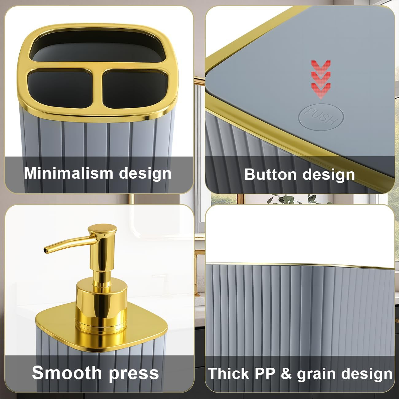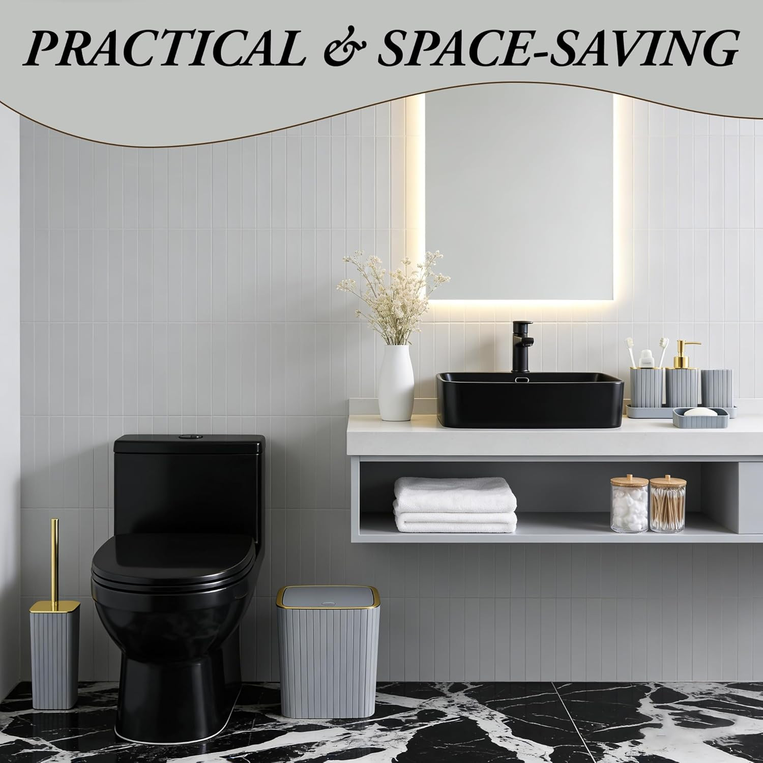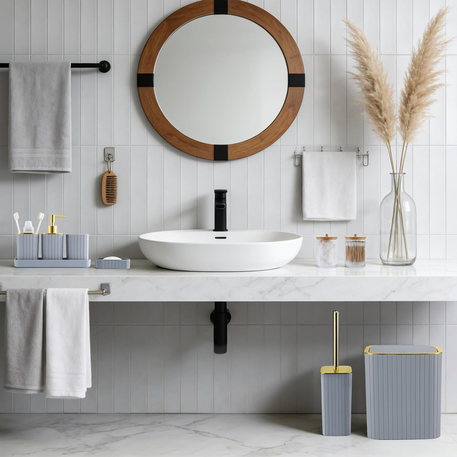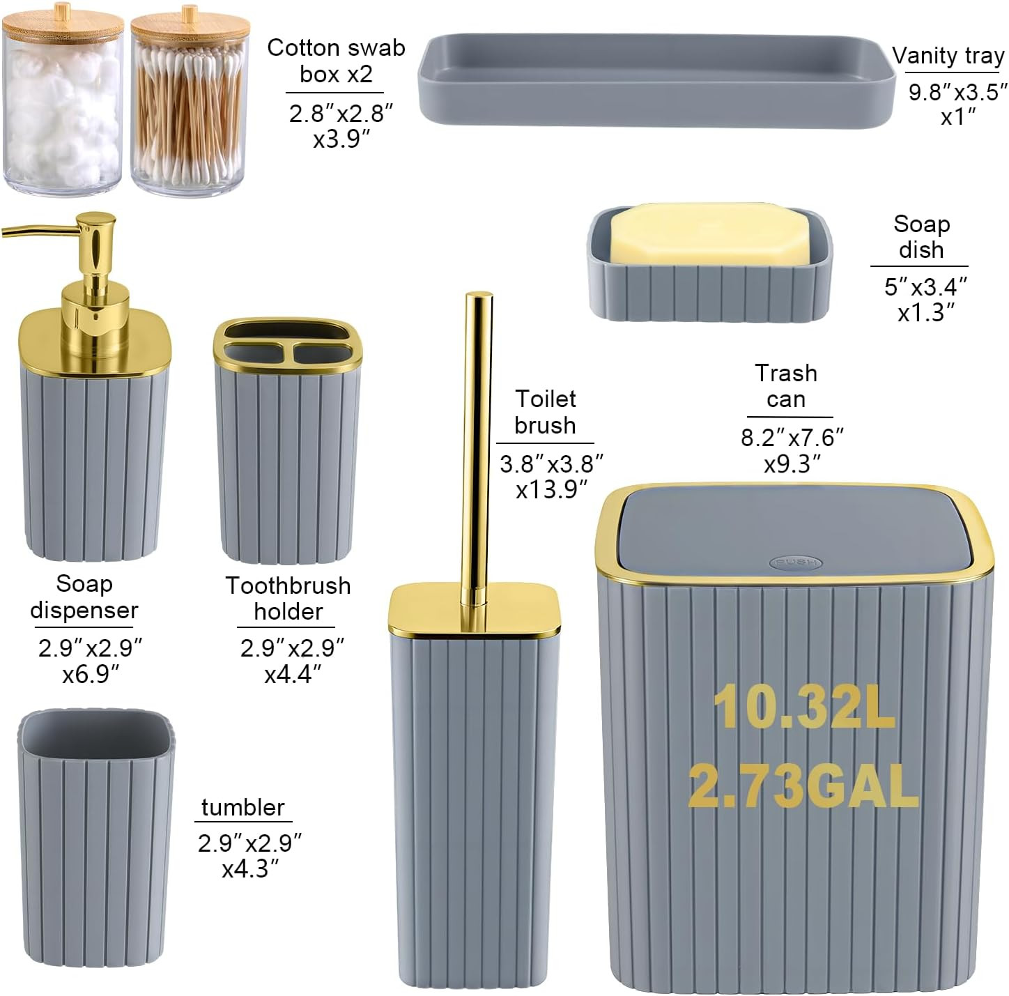 Grey Bathroom Accessory Set-9Pc Set with Toilet Brush, Trash Can, Soap Dispenser