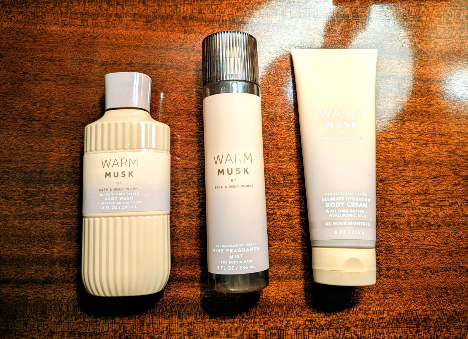Bath and Body Works WARM MUSK 3pc Set. Fragrance Mist, Body Cream Wash