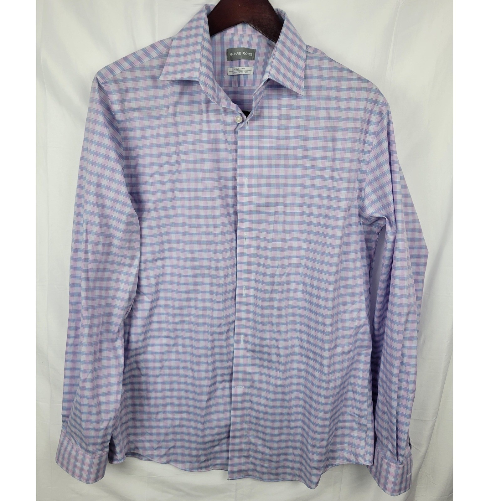 Michael Kors Regular Fit Purple Plaid Long Sleeve Dress Shirt 16 34/35
